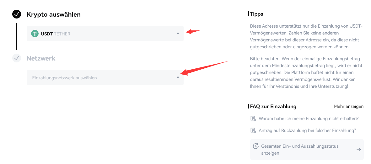 2. Nachdem Sie zur Einzahlungsseite navigiert sind, wählen Sie die Kryptowährung aus, die Sie einzahlen möchten, und wählen Sie den Einzahlungsnetzwerktyp aus, den Sie verwenden möchten.