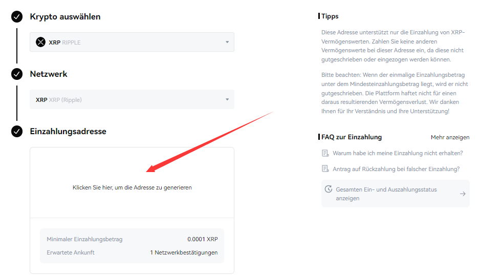 3. Wenn Sie noch nie eine Einzahlungsadresse erhalten haben, klicken Sie auf [Klicken Sie, um eine Adresse zu generieren], um die entsprechende Krypto-Einzahlungsadresse im ausgewählten Netzwerk zu erhalten.