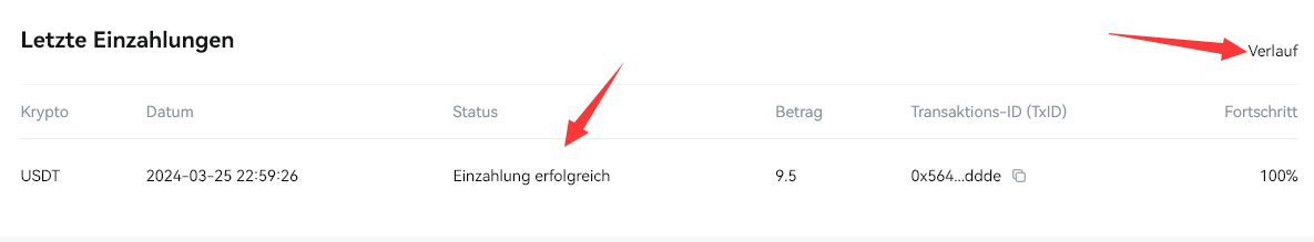 5. Nach der Initiierung des Auszahlungsantrags muss die Krypto-Einzahlung vom Block bestätigt werden. Sobald die Sperrbestätigung abgeschlossen ist, wird die Anzahlung Ihrem Konto gutgeschrieben. Bitte überprüfen Sie Ihr [Spot]-Konto. Sie können die letzten Einzahlungsdatensätze im Abschnitt „Einzahlungsverlauf“ unten auf der Einzahlungsseite einsehen oder auf „Einzahlungsverlauf“ klicken, um alle historischen Einzahlungsdatensätze anzuzeigen.