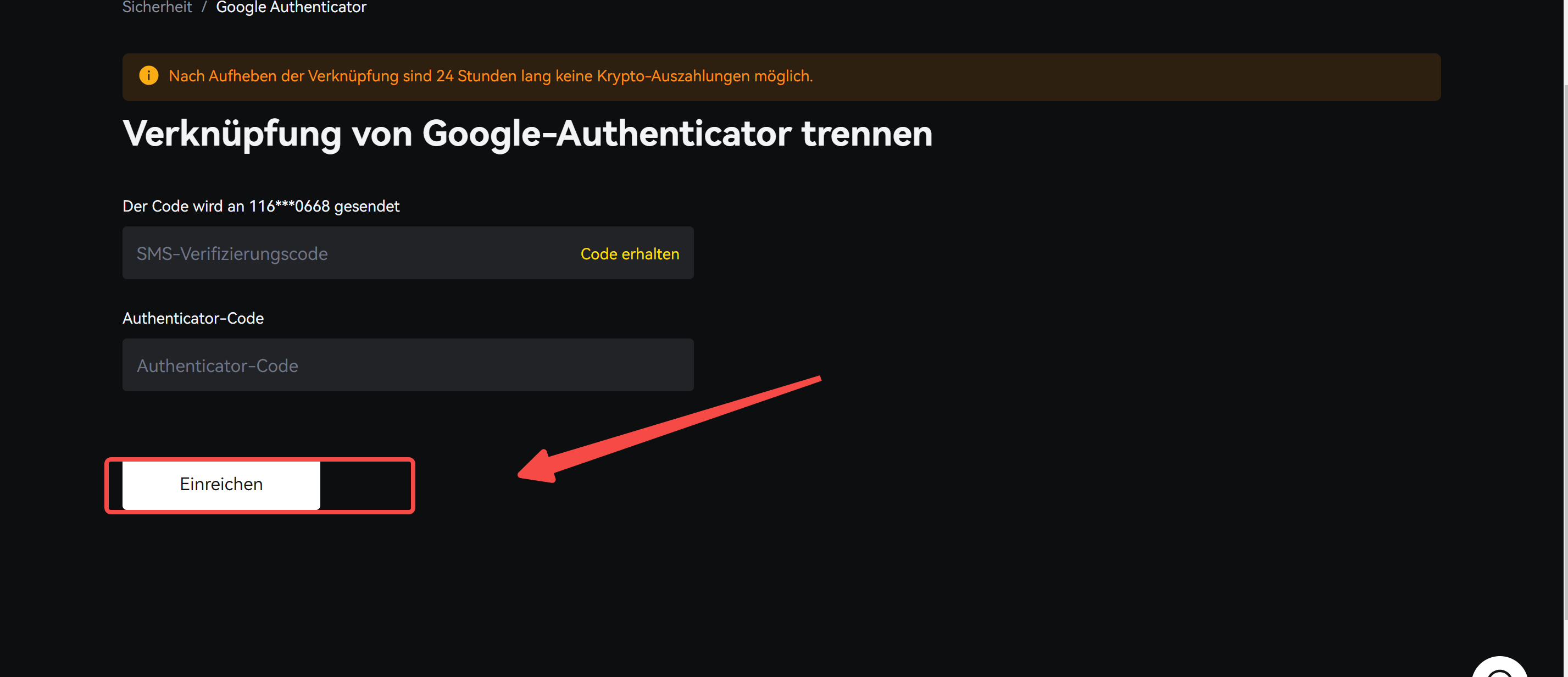 4. Geben Sie Ihren E-Mail-Verifizierungscode / SMS-Verifizierungscode / Google-Verifizierungscode ein und klicken Sie auf "Absenden", um den Entbindungsprozess abzuschließen.