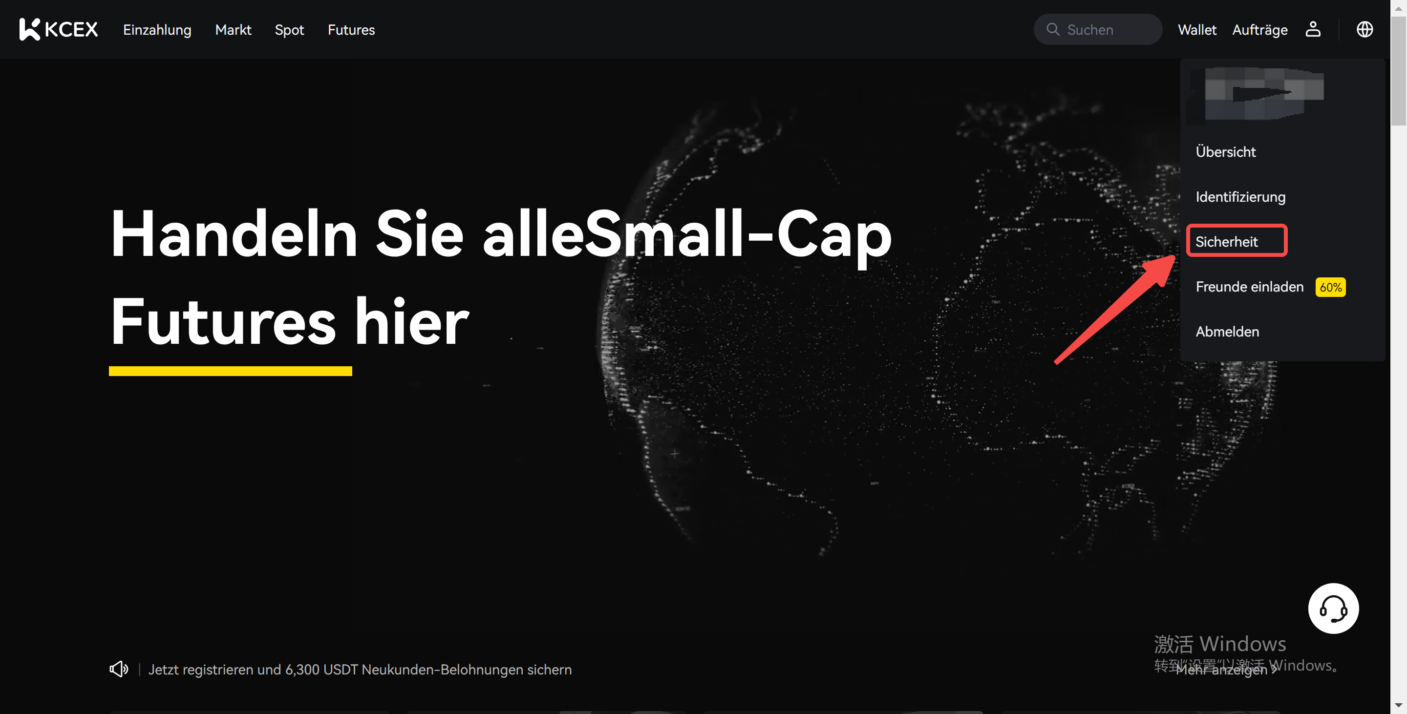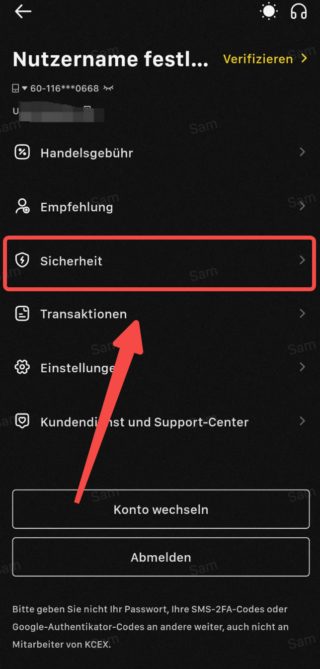 1. Melden Sie sich auf der offiziellen KCEX-Website an, bewegen Sie den Mauszeiger über das Benutzersymbol und klicken Sie auf [Sicherheit].