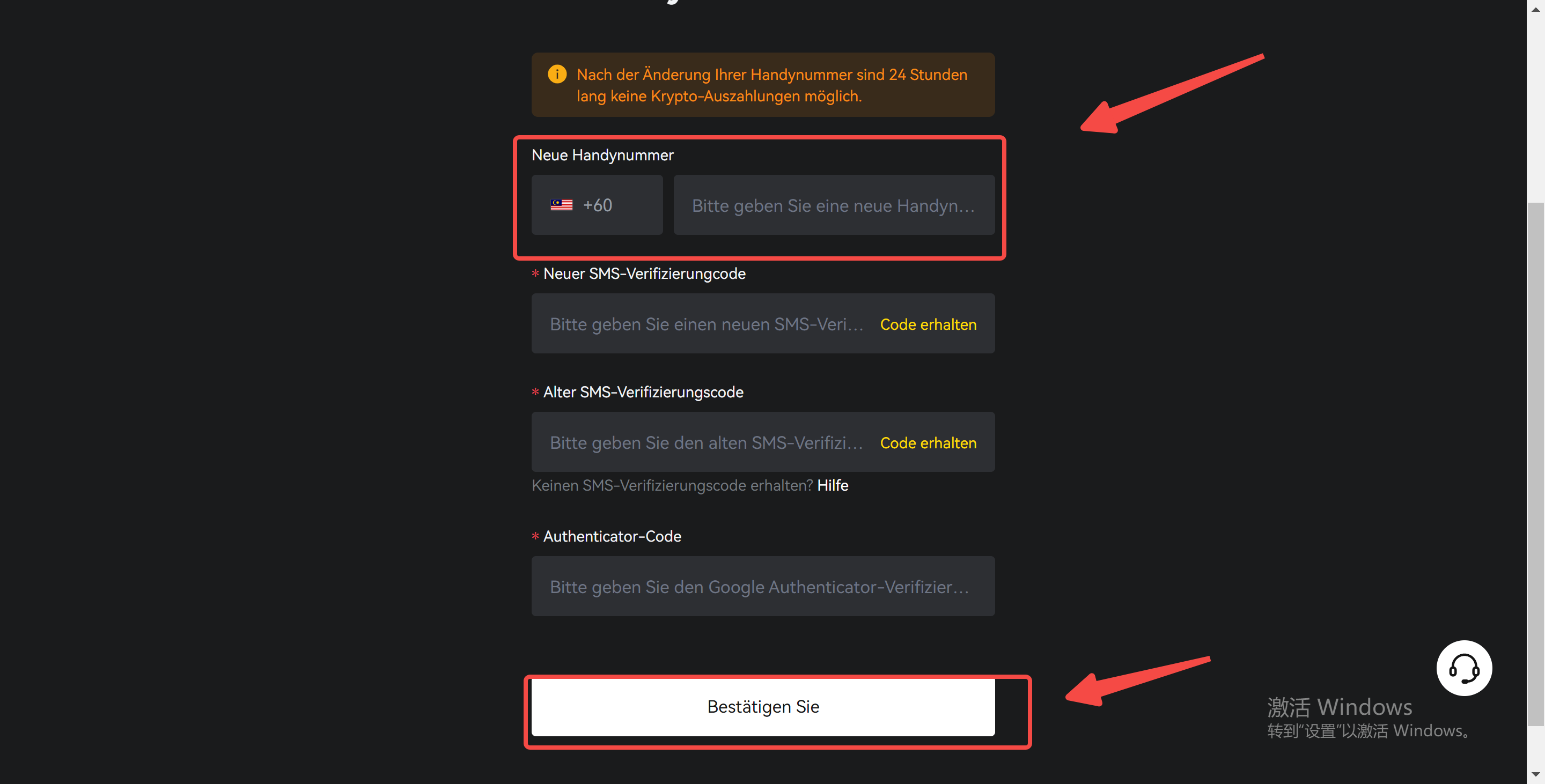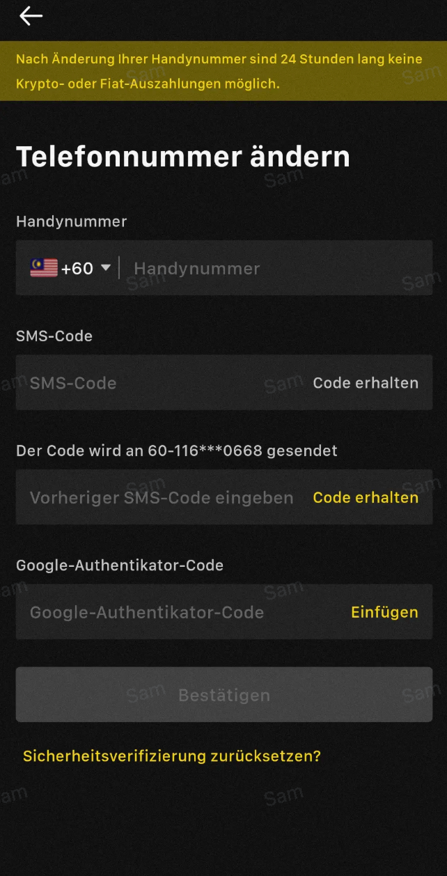 3. Wählen Sie den Ländercode aus und geben Sie Ihre Mobiltelefonnummer zusammen mit dem neuen SMS-Bestätigungscode, dem vorherigen SMS-Bestätigungscode und dem Google-Authentifikatorcode ein. Klicken Sie abschließend auf [Bestätigen], um den Änderungsvorgang abzuschließen.
