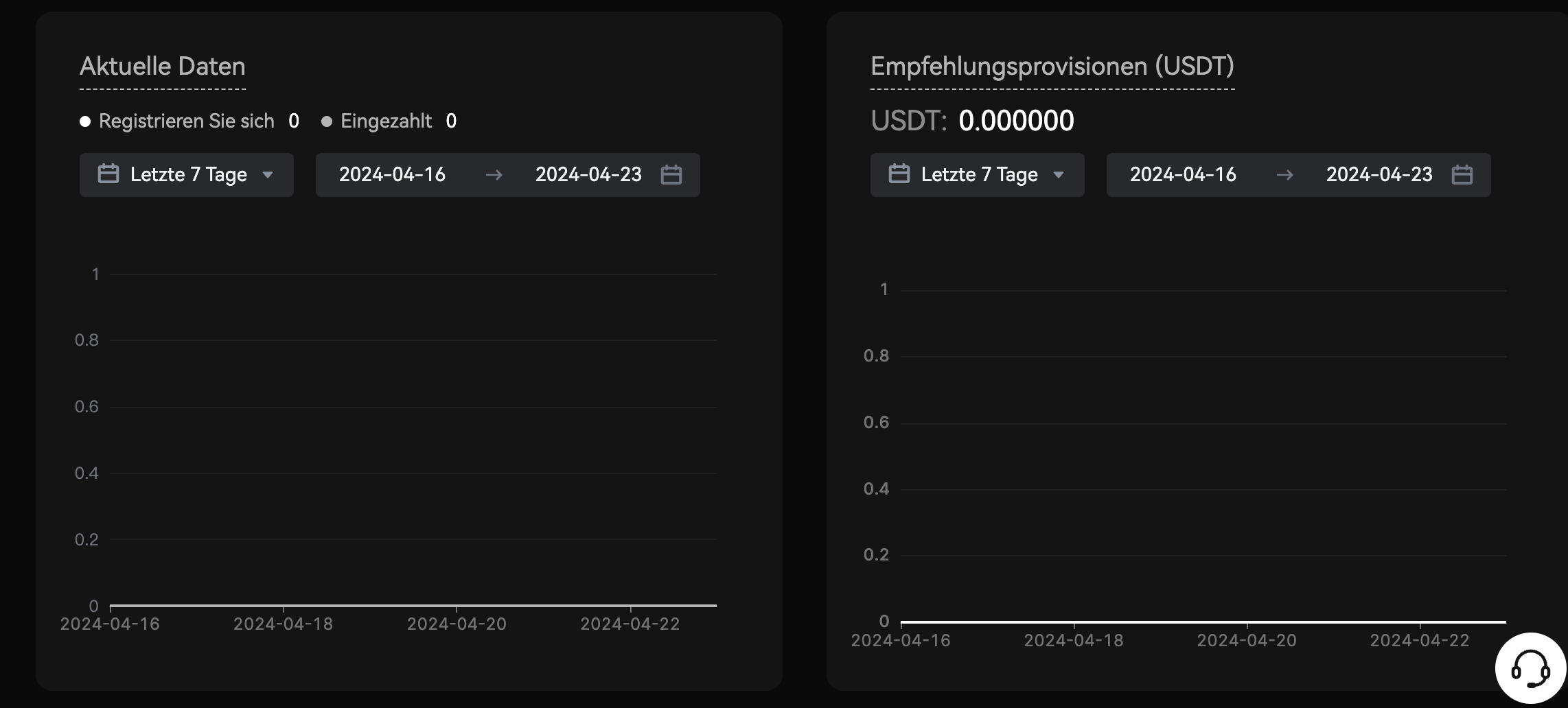 Die hier angezeigten Diagramme bieten Ihnen Trends bei der Registrierung und den Einzahlungen der Kunden sowie die von Ihnen verdienten Provisionen. Durch Auswahl verschiedener Datumsbereiche können Sie leicht beobachten, wie sich Ihre Werbeeffekte im Laufe der Zeit verändern.