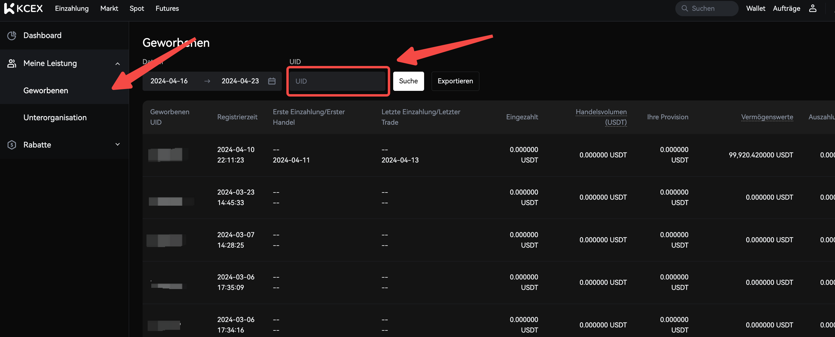 Im Kunden-Interface können Sie spezifische Benutzerdaten einsehen, einschließlich Ein- und Auszahlungsbeträge, generierte Provisionen und ihr Handelsvolumen. Sie können auch ihren aktuellen Vermögensstatus sehen. Zusätzlich können Sie die UID des Kontos verwenden, um schnell spezifische Kundendetails zu suchen und darauf zuzugreifen. Bitte beachten Sie, dass die Daten im Kunden-Interface in Echtzeit aktualisiert werden, sodass Sie jederzeit die neueste Situation Ihrer Kunden überwachen und steuern können.
