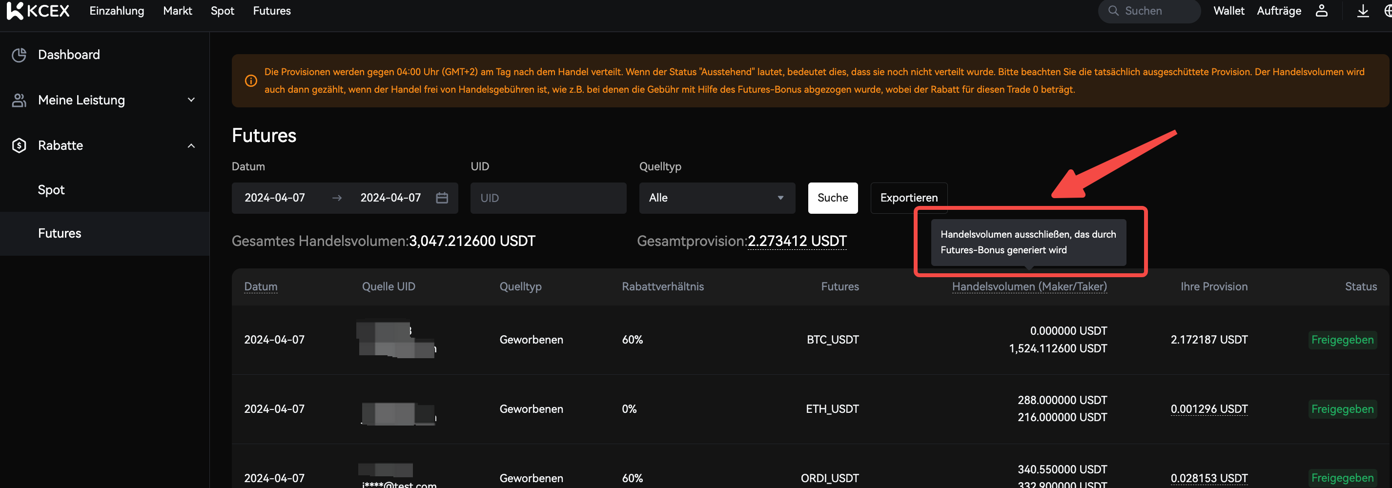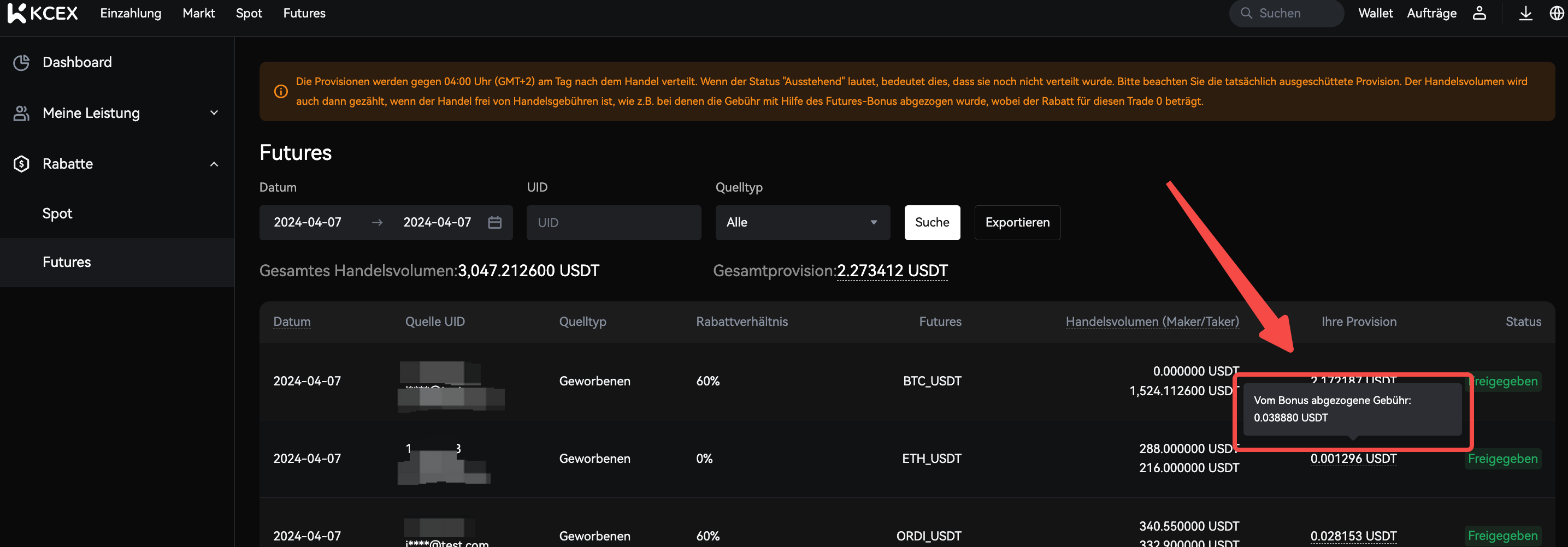Wenn Kunden Futures-Boni verwenden, um Gebühren zu kompensieren, werden die damit verbundenen Gebühren nicht in die Provision einbezogen, und Sie können über „Ihre Provision“ einsehen, wie viel Bonusgeld Benutzer für Kompensationen verwendet haben.