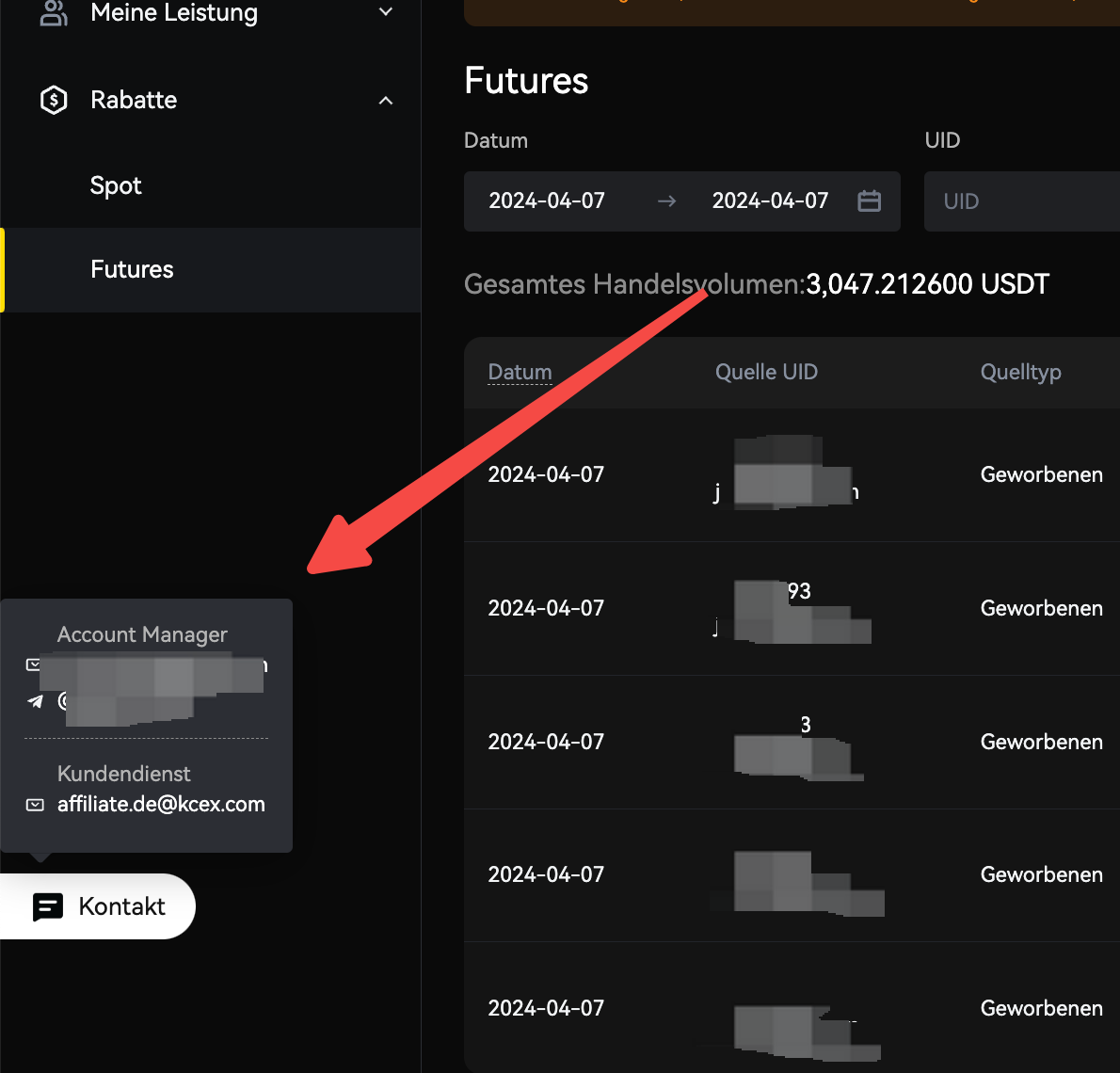 Hinweis: Wenn Sie während der Nutzung Verwirrung erleben oder Hilfe benötigen, zögern Sie nicht, Ihren dedizierten Kontomanager zu kontaktieren oder das Kundenservice-Symbol in der unteren rechten Ecke anzuklicken, um jederzeit unseren Online-Kundenservice zu kontaktieren. Sie können auch eine E-Mail an affiliate@kcex.com senden, und wir werden uns voll und ganz dafür einsetzen, Ihnen Unterstützung zu bieten.
