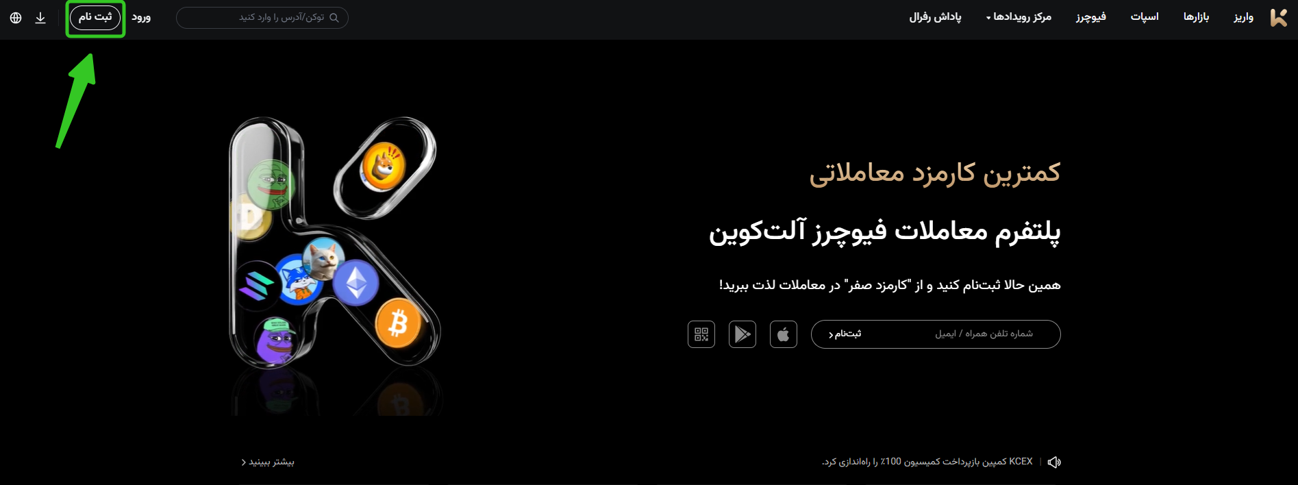 1. به وب‌سایت رسمی KCEX به آدرس www.kcex.com بروید و روی دکمه "ثبت نام" که در گوشه بالا سمت راست قرار دارد کلیک کنید.