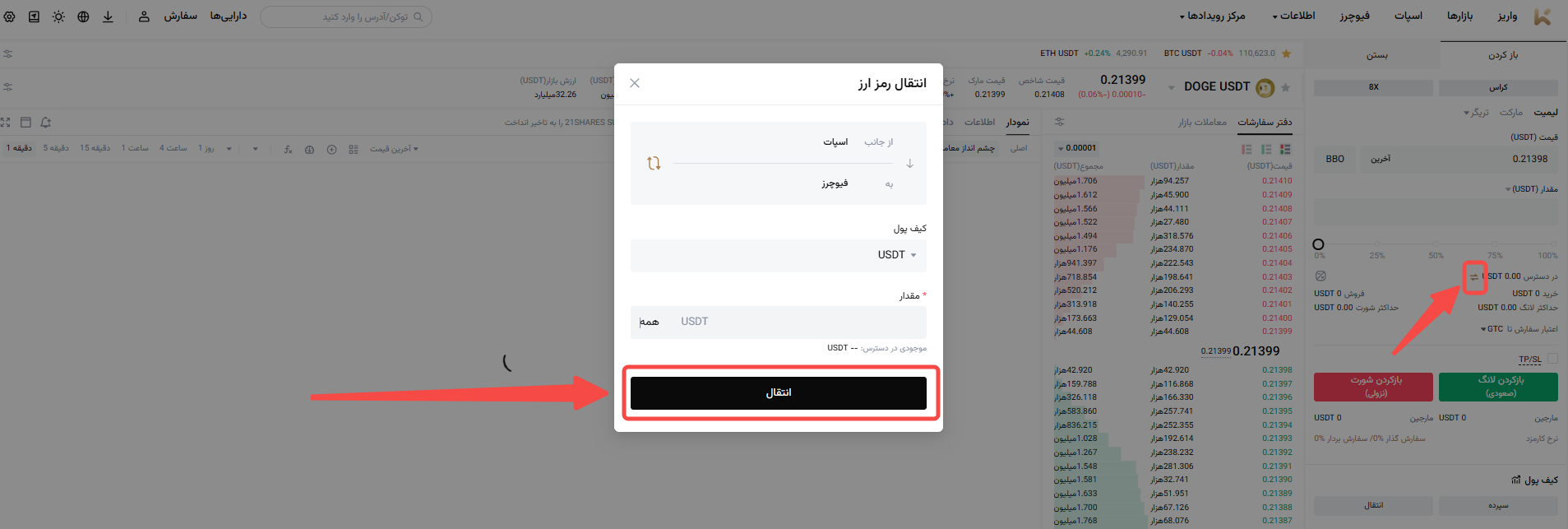 2.میتوانید وجوه خود را از [حساب اسپات] به [حساب فیوچرز] منتقل کنید. مقدار مورد نظر را مشخص کنید و بر روی [انتقال] کلیک کنید.