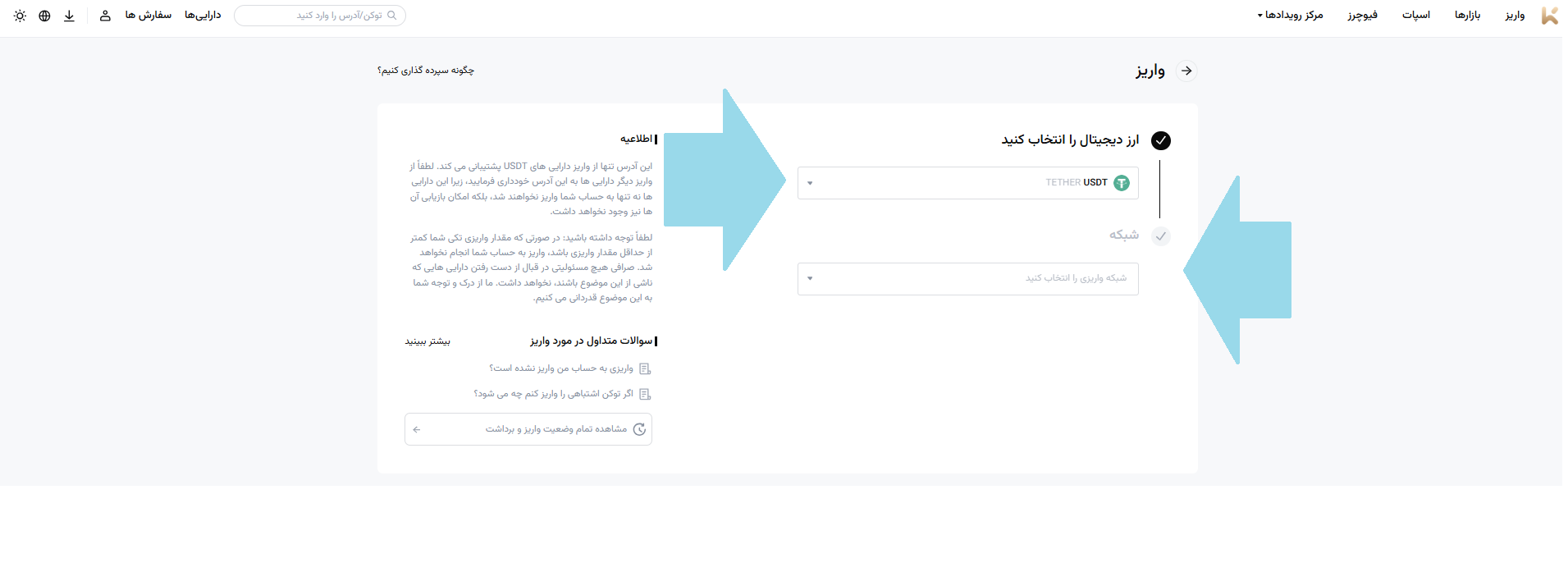 ۲. پس از ورود به صفحه واریز، ارز دیجیتال مورد نظر برای واریز را انتخاب کنید و نوع شبکه واریز را که میخواهید استفاده کنید، انتخاب کنید.