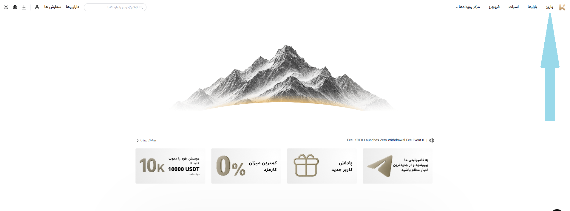 ۱. وارد وبسایت رسمی KCEX به آدرس www.kcex.com شوید و بر روی [واریز] کلیک کنید.