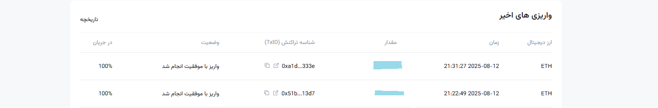 ۵. پس از آغاز درخواست برداشت، واریز ارز دیجیتال باید توسط بلاک تأیید شود. پس از تکمیل تأیید بلاک، واریز به حساب شما اعتبار خواهد یافت. لطفاً در حساب اسپات خود بررسی کنید. میتوانید سوابق واریز اخیر را در بخش "تاریخچه واریز" در پایین صفحه واریز مشاهده کنید یا بر روی "تاریخچه واریز" کلیک کنید تا تمام سوابق واریز تاریخی را ببینید.