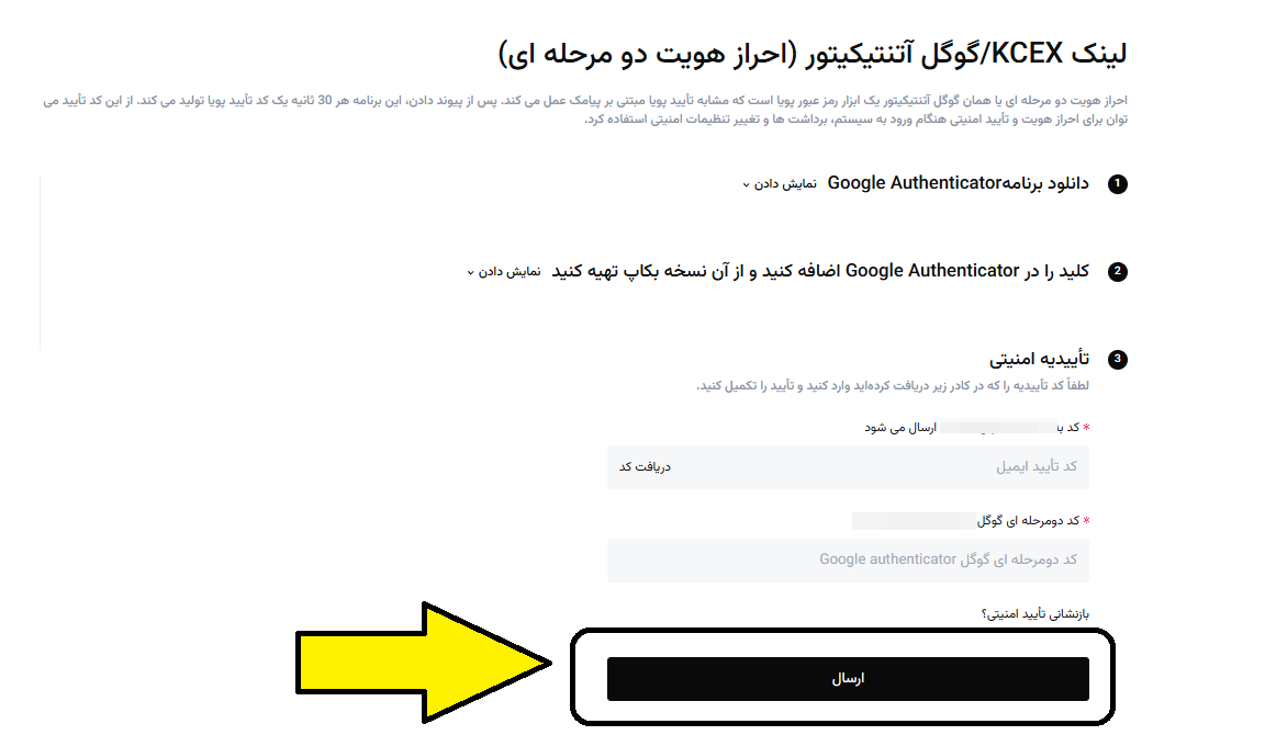 6. کد تأیید ایمیل/کد تأیید پیامک و کد تأیید Google را وارد کنید، سپس برای تکمیل فرآیند الزام آور، روی [ارسال] کلیک کنید.