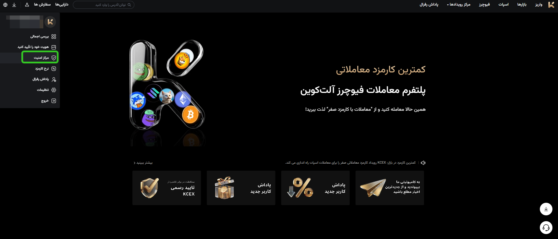 1. وارد وب سایت رسمی KCEX شوید، نشانگر را روی نماد کاربر نگه دارید و روی [Security]یا [امنیت] کلیک کنید.