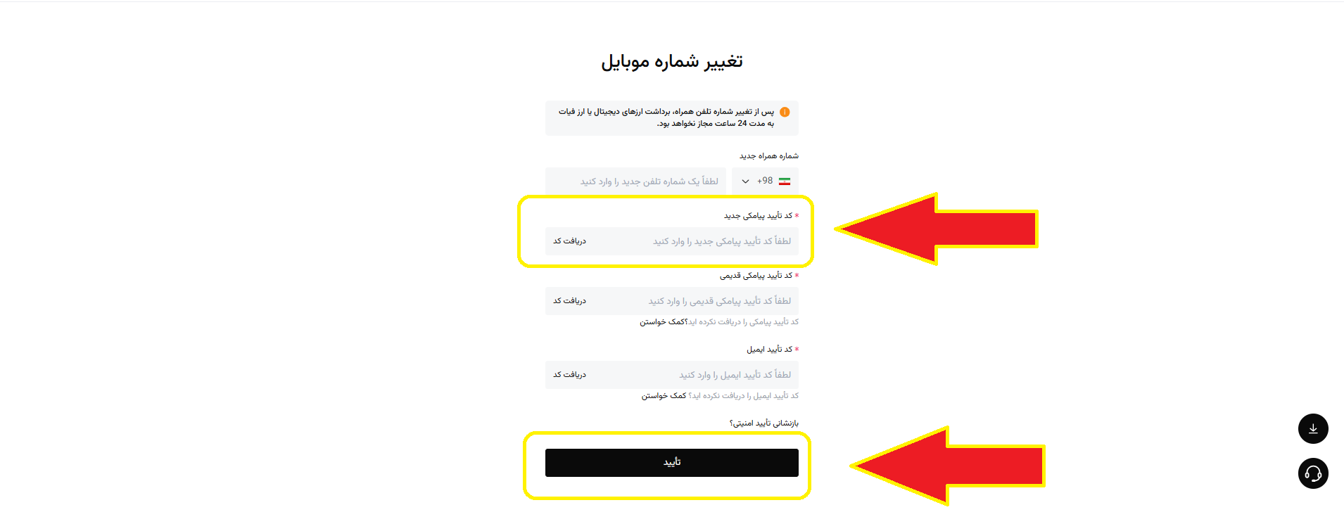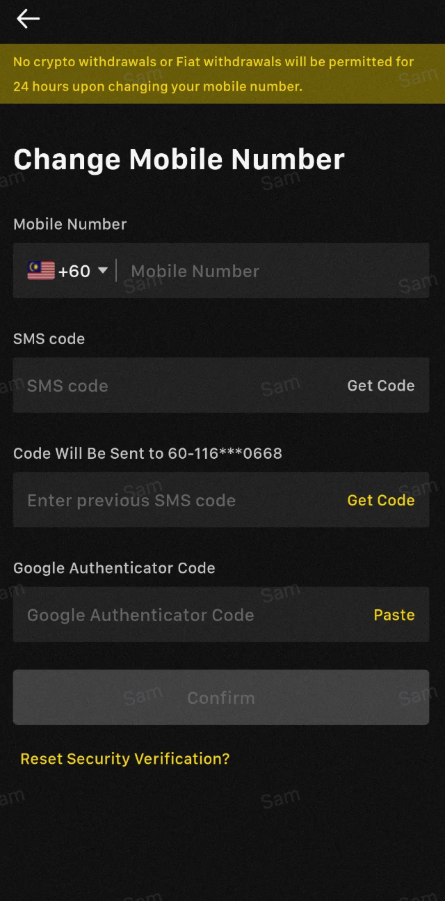 3. کد کشور را انتخاب کنید و شماره موبایل خود را به همراه کد تأیید پیامک جدید، کد تأیید پیامک قبلی و کد تأیید کننده Google وارد کنید. در نهایت، برای تکمیل فرآیند تغییر، روی [Confirm] یا تایید کلیک کنید.