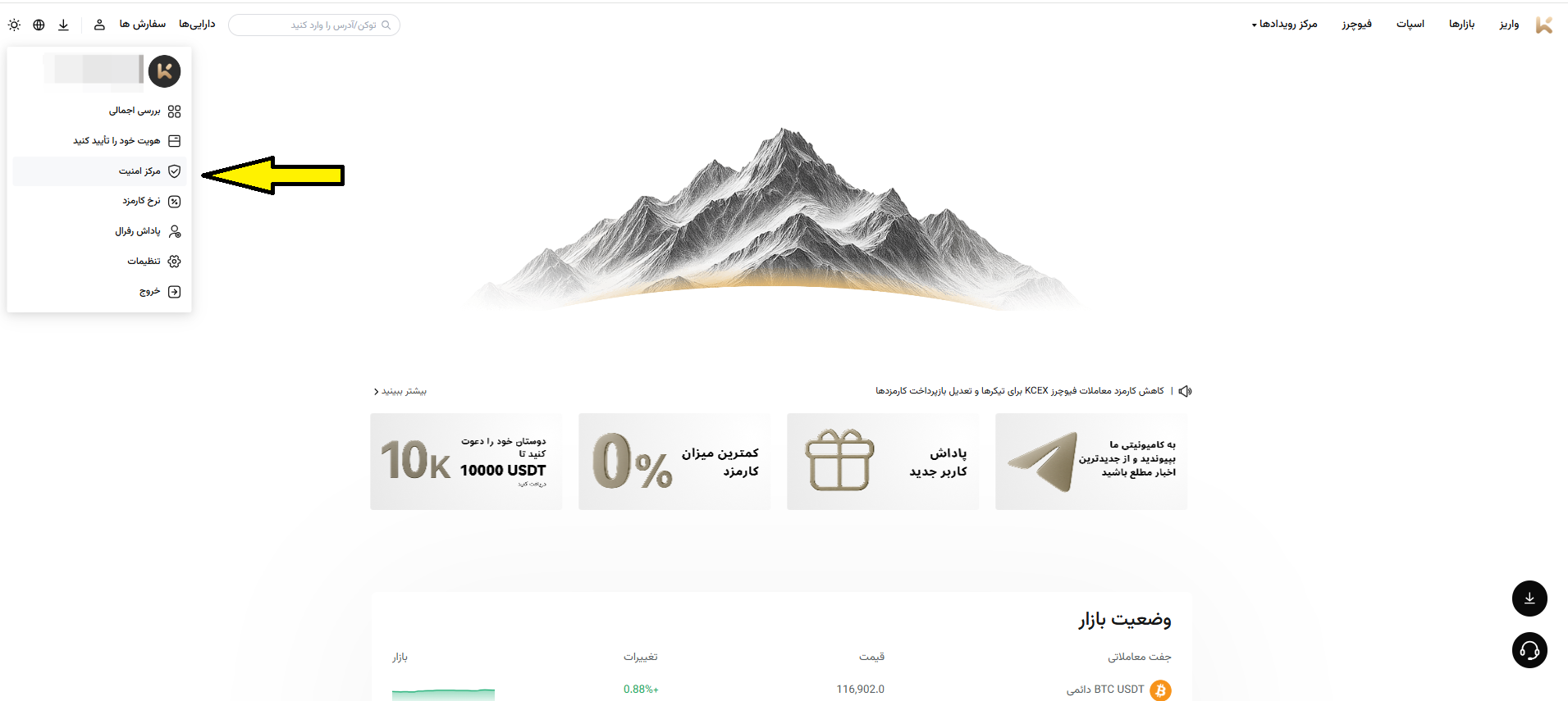 1. وارد وب سایت رسمی KCEX شوید، نشانگر را روی نماد کاربر نگه دارید و روی [Security] یا مرکز امنیت کلیک کنید.