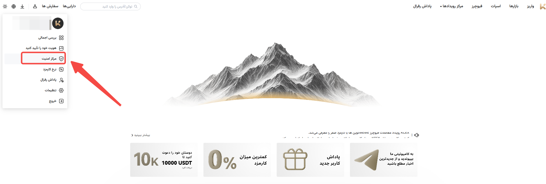 1. وارد وب سایت رسمی KCEX شوید، نشانگر را روی نماد کاربر نگه دارید و روی [مرکز امنیت] کلیک کنید.