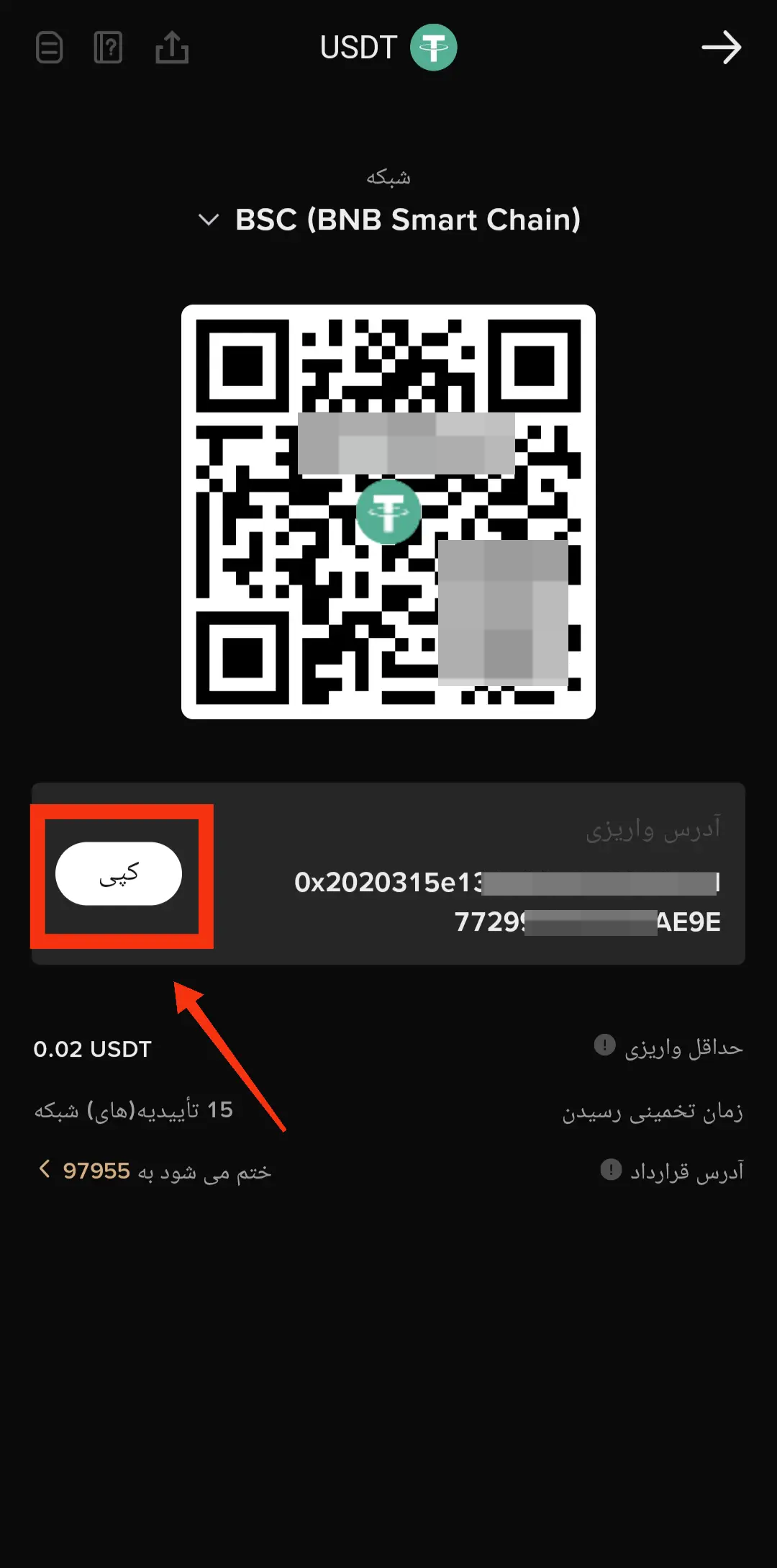 *قبل از ادامه، باید آدرس قرارداد رمزی را نیز تأیید کنید. اطمینان حاصل کنید که آدرس قرارداد داراییای که واریز میکنید با آدرس قرارداد رمزارز پشتیبانی شده توسط KCEX مطابقت دارد، در غیر این صورت ممکن است داراییهای شما از بین برود. برای تغییر مسیر و مشاهده آدرس کامل می توانید در انتهای آدرس قرارداد روی حروف رنگی کلیک کنید.