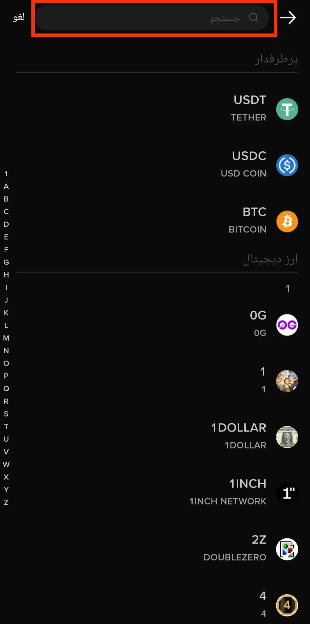 2. ارز دیجیتال مورد نظر برای واریز را انتخاب کنید، مثلاً "USDT".