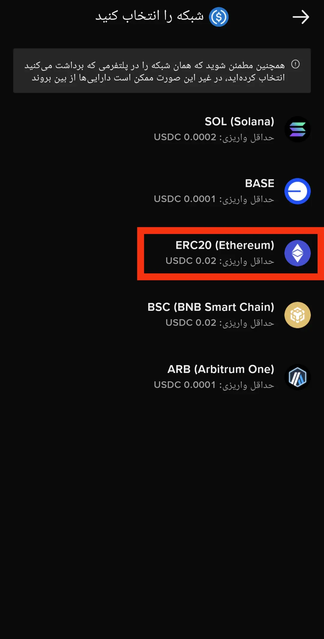 *در هنگام انتخاب شبکه انتقال، لطفاً مطمئن شوید که با شبکه پلتفرم مبدا برداشت شما مطابقت دارد. به عنوان مثال، اگر شبکه ERC20 را در KCEX انتخاب کرده اید، باید شبکه ERC20 را برای برداشت در پلتفرم برداشت خود نیز انتخاب کنید. انتخاب شبکه نادرست ممکن است منجر به از دست رفتن سرمایه تان شود.