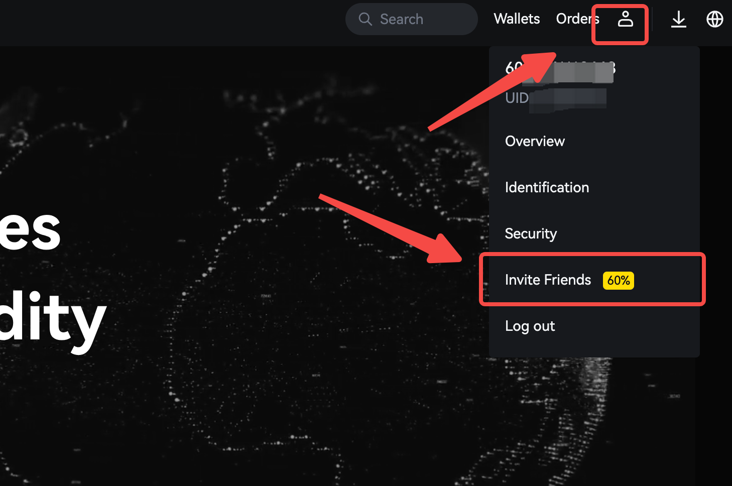 ابتدا، پس از ورود به پلتفرم KCEX، لطفاً روی "Personal Center" در گوشه سمت راست بالا کلیک کنید و "دعوت دوستان" را انتخاب کنید تا وارد داشبورد دعوت KCEX شوید.