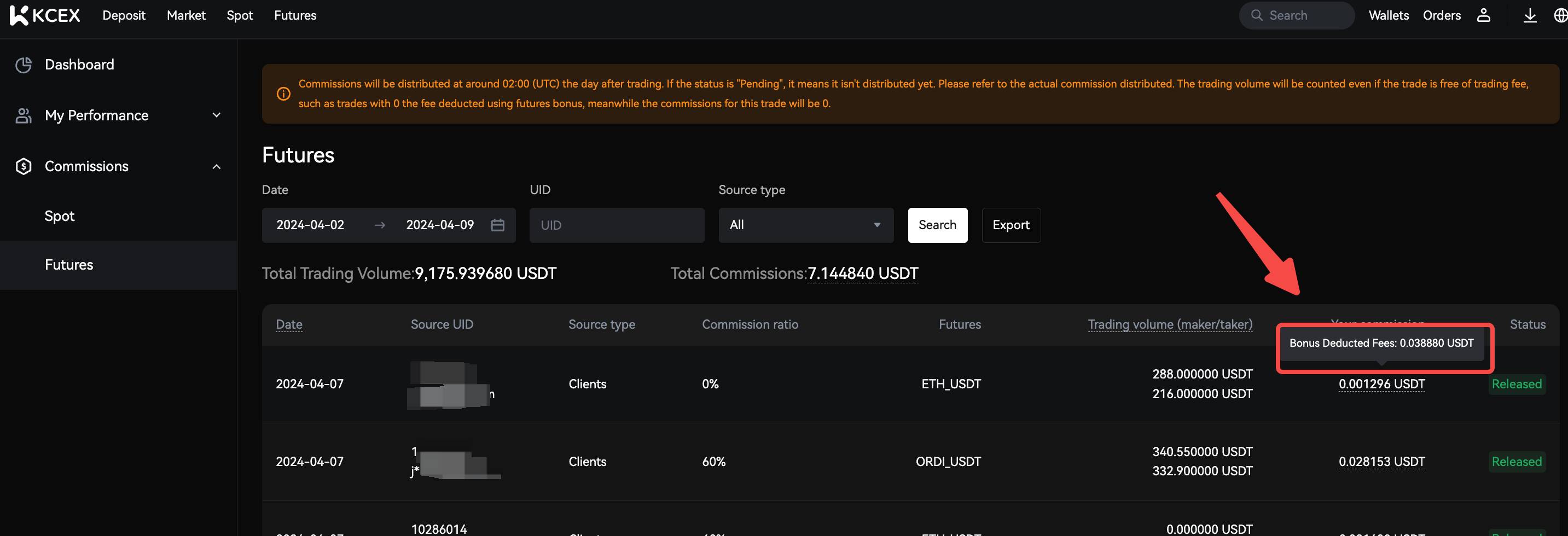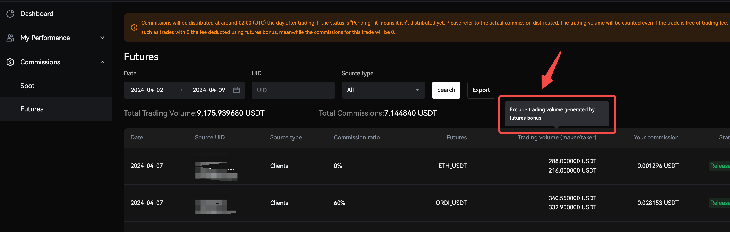 اگر مشتریان از پاداش فیوچرز برای جبران کارمزدها استفاده کنند، کارمزدهای مربوطه شامل کمیسیون نمیشود و میتوانید از طریق «کمیسیون شما» مشاهده کنید که کاربران چقدر پاداش فیوچرز برای جبران هزینهها استفاده کردهاند.