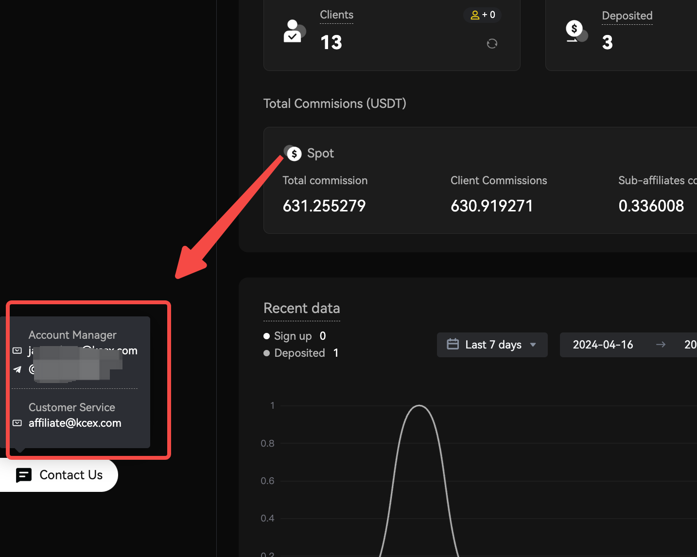 توجه: اگر در حین استفاده با سردرگمی مواجه شدید یا به کمک نیاز داشتید، با خیال راحت با مدیر حساب اختصاصی خود تماس بگیرید یا روی نماد خدمات مشتری در گوشه سمت راست پایین کلیک کنید تا در هر زمان با خدمات مشتری آنلاین ما تماس بگیرید. علاوه بر این، شما همچنین می توانید یک ایمیل به affiliate@kcex.com ارسال کنید و ما به ارائه پشتیبانی از شما اختصاص خواهیم داد.
