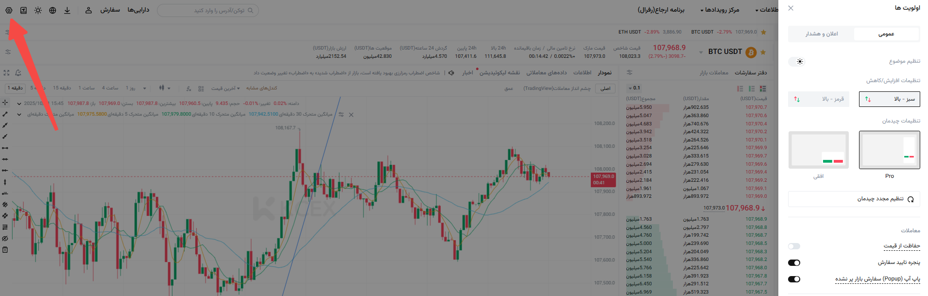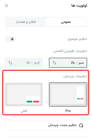 برای برآورده کردن بهتر نیازهای عملیاتی شما، گزینه های قابل تنظیم برای تم و طرح نمای صفحه معاملاتی شما را ارائه می دهیم. با مراحل ساده زیر به راحتی می توانید رابط کاربری را مطابق با ترجیحات خود تنظیم کنید: