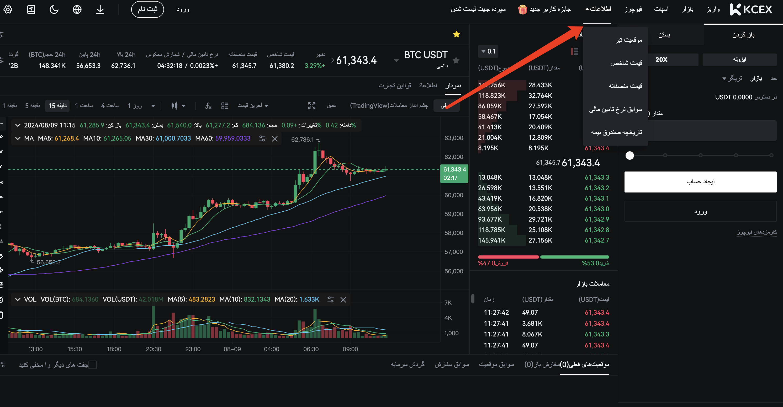 شما می توانید مشخصات معاملاتی مربوطه را در نماد اعلان سمت راست در رابط معاملات فیوچرز مشاهده کنید .