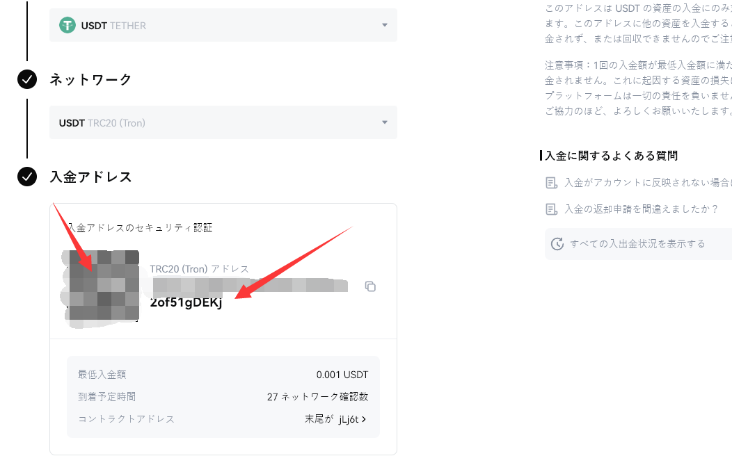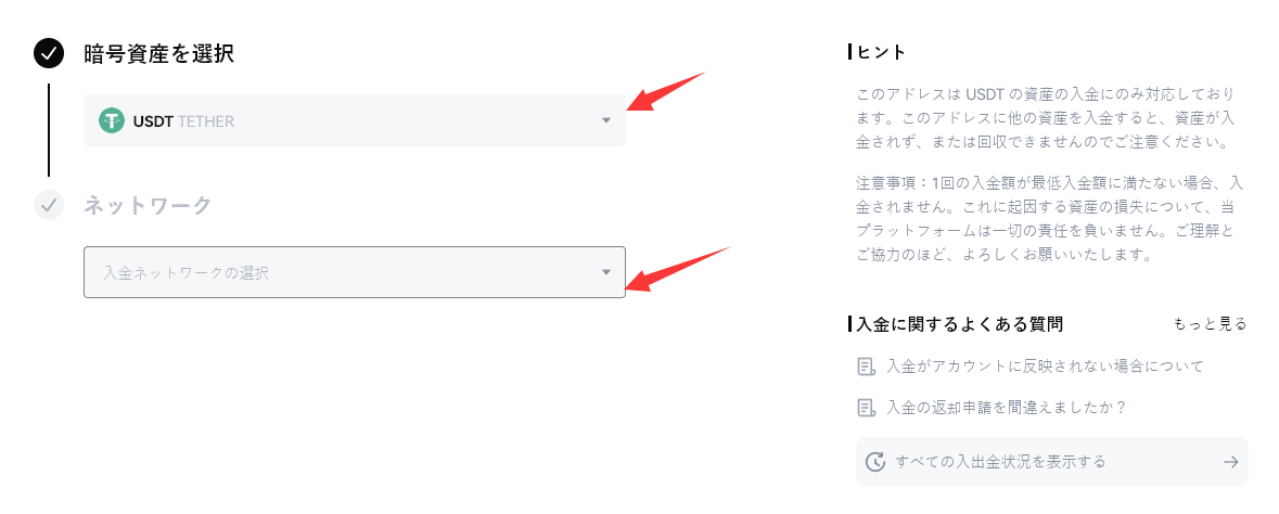 2. 入金ページに移動した後、入金する暗号通貨を選択し、使用する入金ネットワークのタイプを選択します。