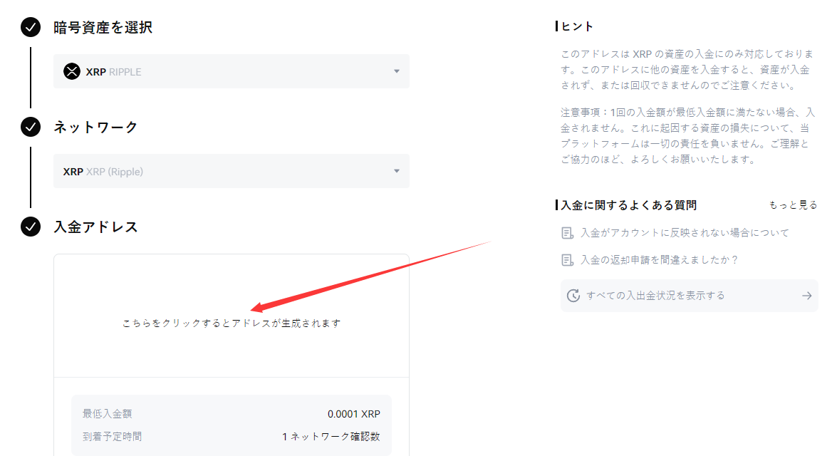 3. これまでに入金アドレスを取得したことがない場合は、[クリックしてアドレスを生成] をクリックして、選択したネットワークで対応する暗号入金アドレスを取得します。