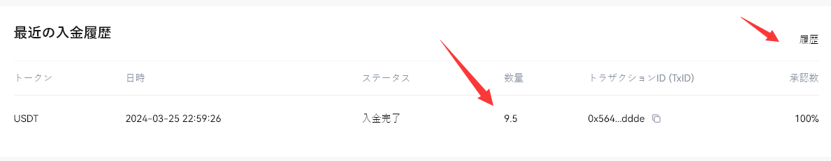 5. 出金申請を開始した後、暗号通貨デポジットはブロックによって確認される必要があります。ブロックの確認が完了すると、デポジットがアカウントに入金されます。 [Spot] アカウントを確認してください。入金ページの下部にある「入金履歴」セクションで最近の入金記録を表示するか、「入金履歴」をクリックして過去の入金記録をすべて表示できます。