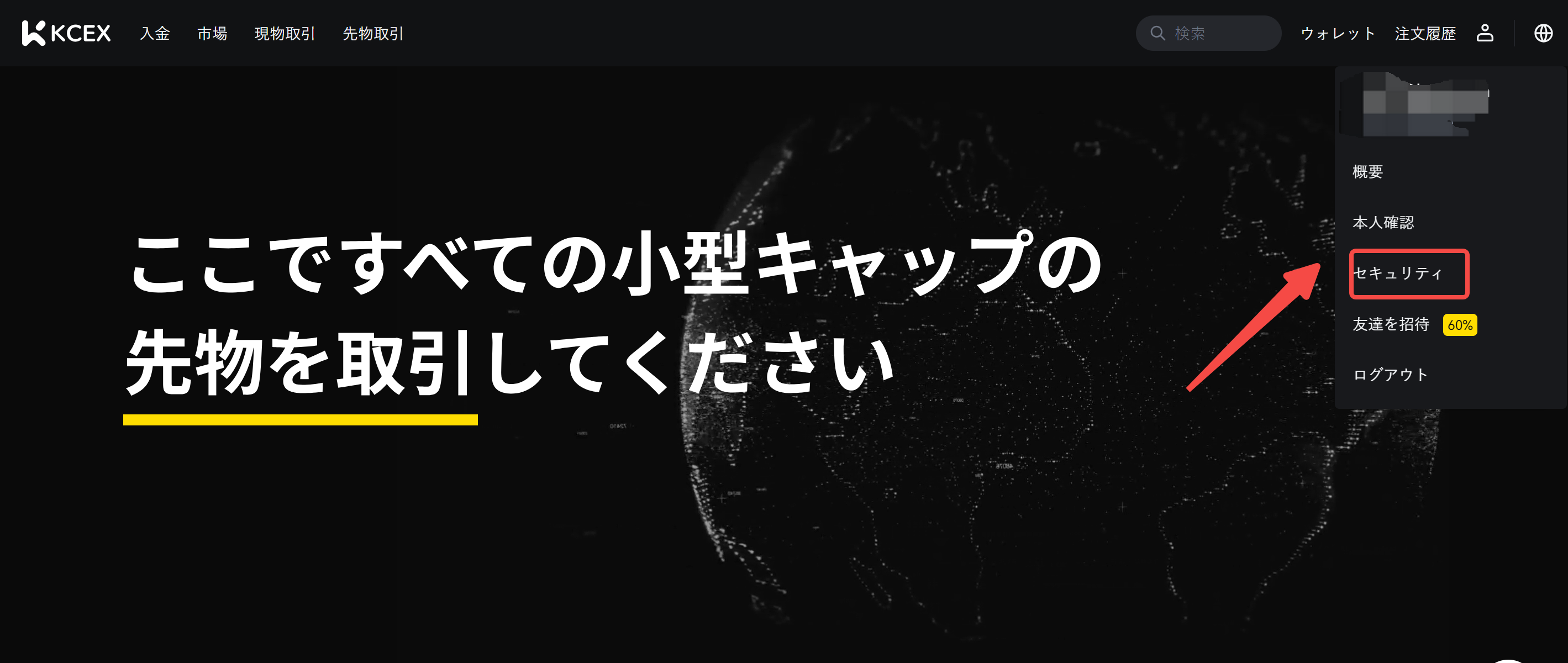 1. KCEX の公式 Web サイトにログインし、ユーザー アイコンの上にマウスを置き、[セキュリティ] をクリックします。