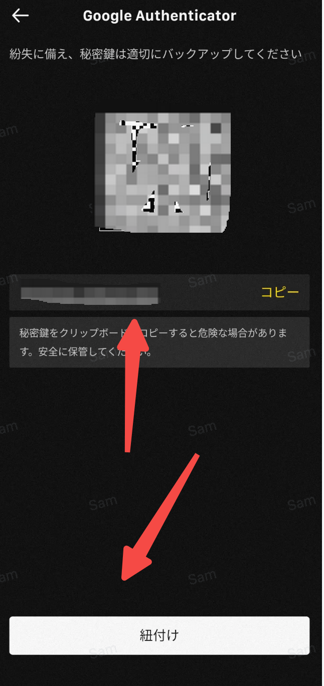 5. 認証アプリを開き、画面に表示されるQRコードをスキャンするか、キーをコピーして貼り付けて認証コードを生成します。新しいデバイスや失われたデバイスでGoogle Authenticatorを復旧する必要がある場合に備えて、このキーを保存してください。