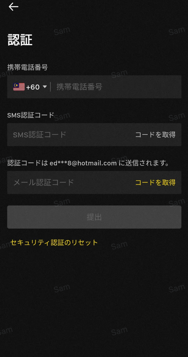 4. 国コードを選択し、携帯電話番号とSMS認証コード、メール認証コード/Google認証コードを入力して、「確認」をクリックし、登録を完了します。
