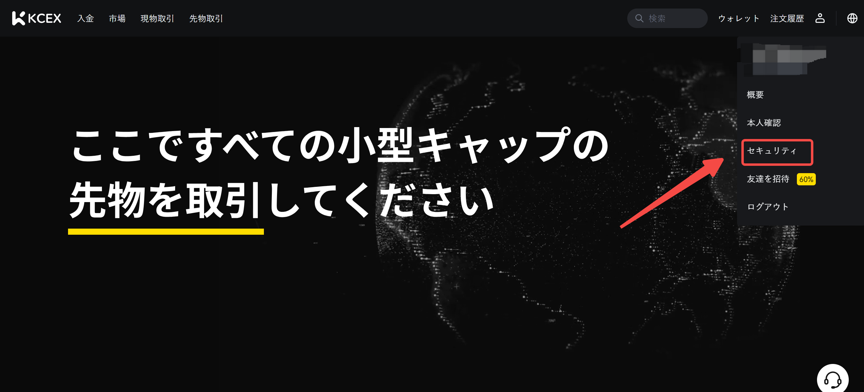 a. KCEX公式Webサイトにログインし、ユーザーアイコンにカーソルを合わせて[セキュリティ]をクリックします。