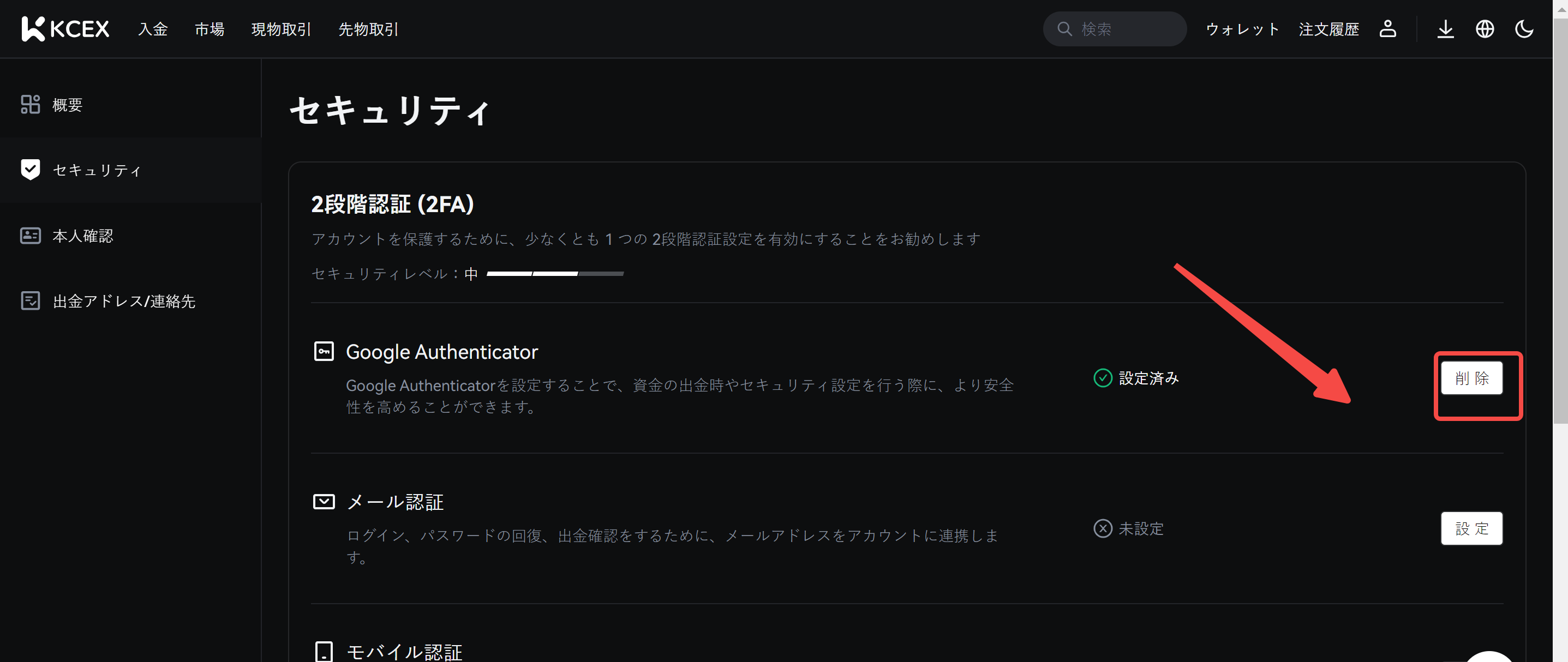 2. [Google Authenticator] セクション内の [削除] をクリックします。