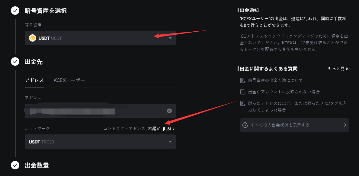 2. 出金したい暗号通貨と出金ネットワークを選択し、出金アドレスを入力します。 ( 選択した引き出しネットワークが受信アドレスのネットワークと一致していることを確認してください。 )
