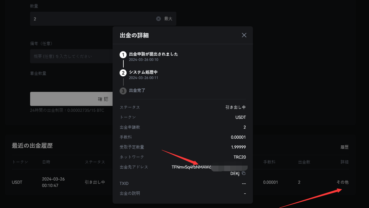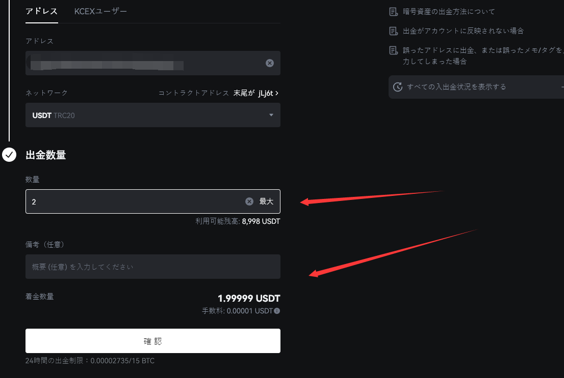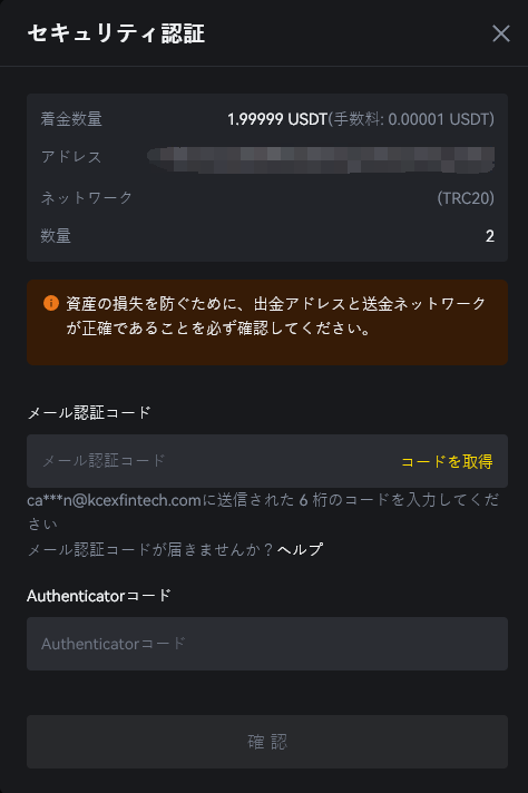 4. 出金 [アドレス] を確認し、電子メール確認コードと Google 認証コードを入力します。内容を確認したら「確認」をクリックしてください。