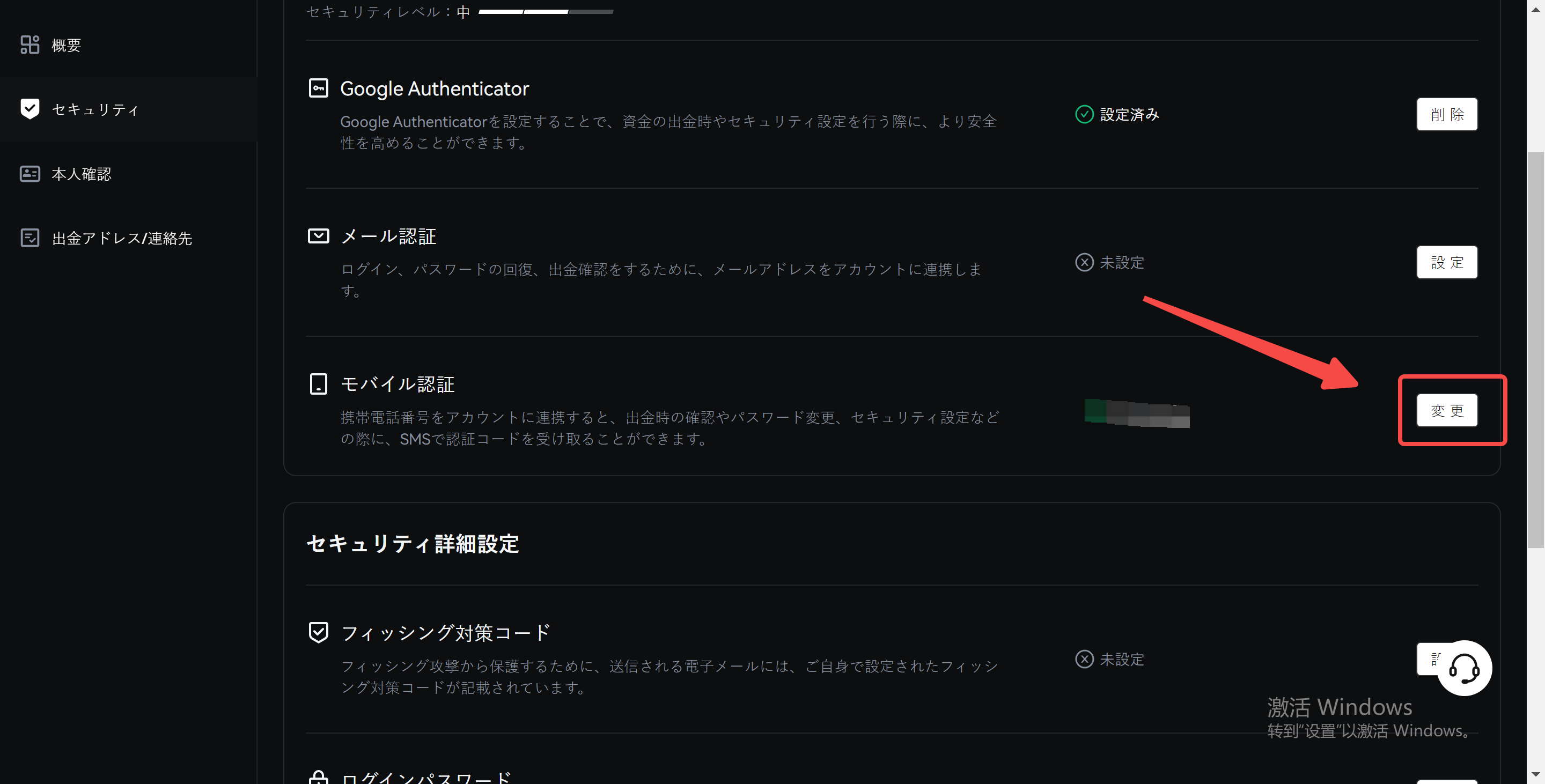 2. [モバイル認証] セクション内の [変更] をクリックします。
