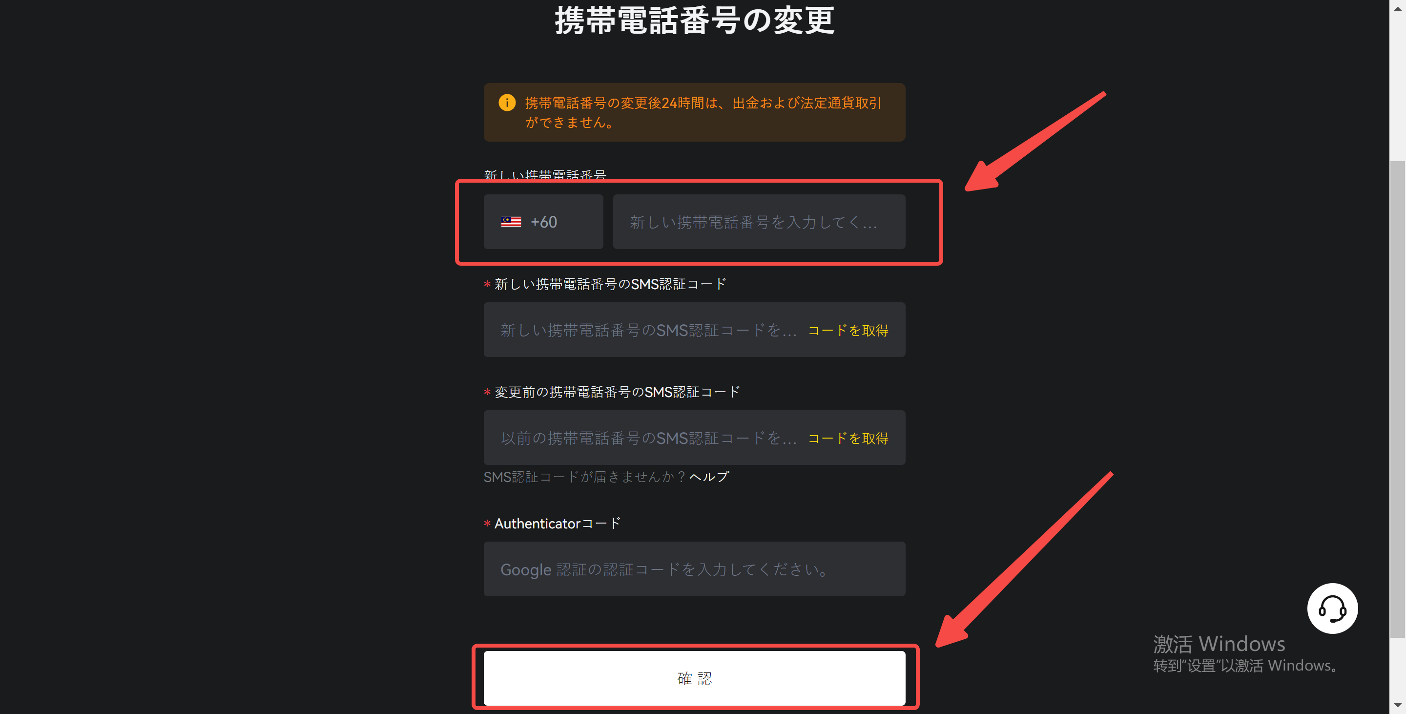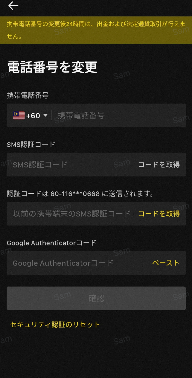 3. 国コードを選択し、携帯電話番号と、新しい SMS 確認コード、以前の SMS 確認コード、および Google 認証コードを入力します。最後に「確認」をクリックして変更手続きは完了です。