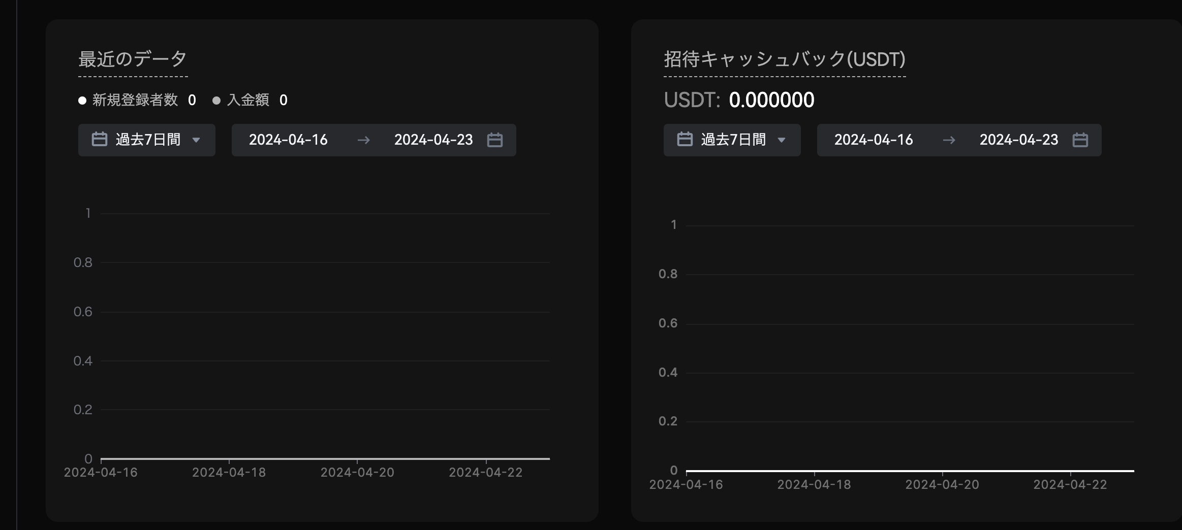 ここに表示されるチャートは、クライアントの登録と入金のトレンド、および獲得したコミッションを提供します。異なる日付範囲を選択することで、時間の経過とともにプロモーション効果の変化を簡単に観察できます。