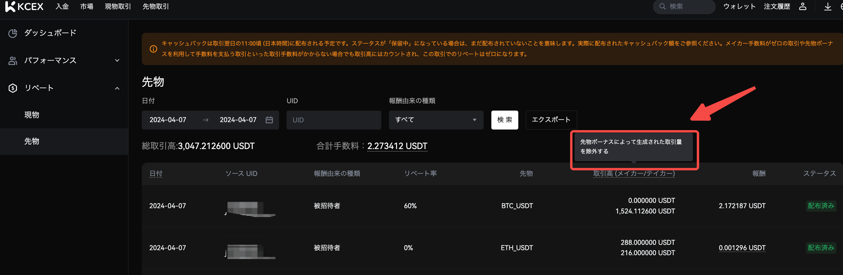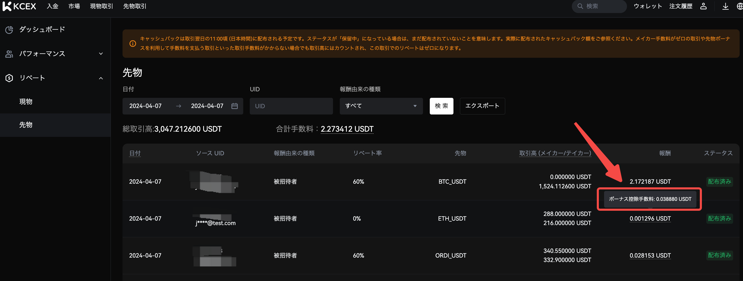 クライアントが先物ボーナスを使用して手数料を相殺する場合、関連する手数料はコミッションに含まれません。また、「あなたのコミッション」を通じて、ユーザーがどれだけのボーナスマネーを使用して相殺したかを確認できます。