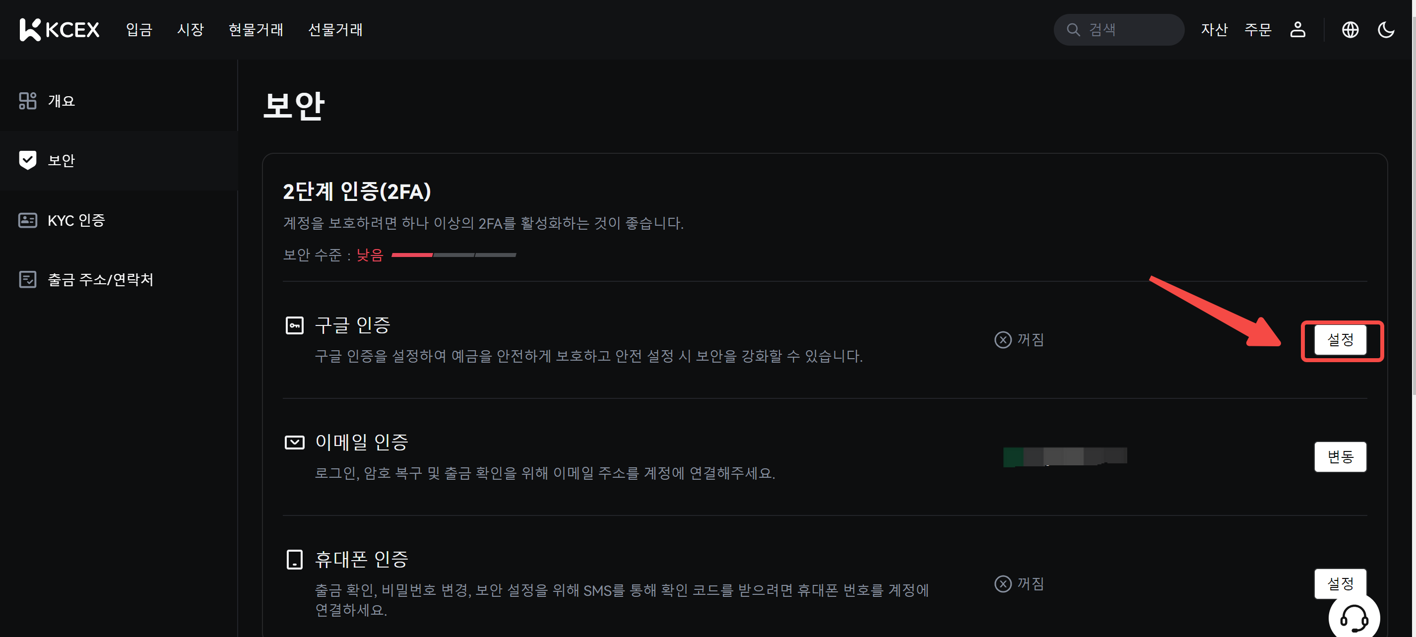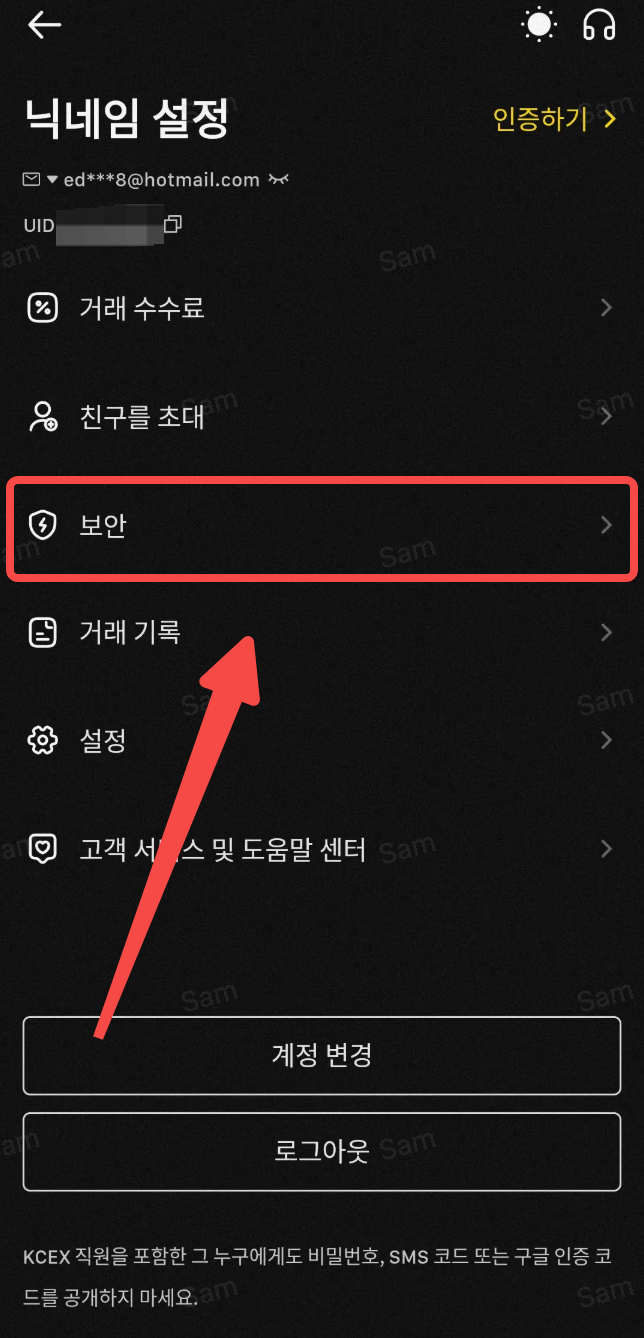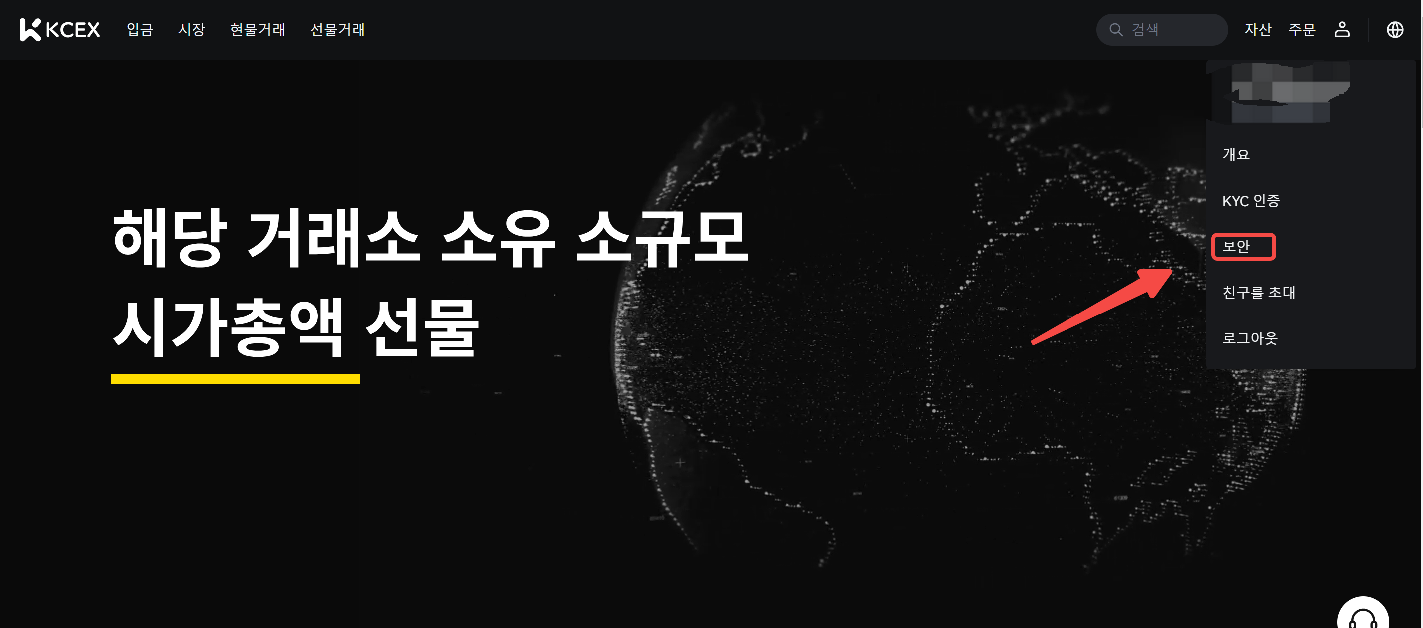 1. KCEX 공식 홈페이지에 로그인 후 사용자 아이콘 - [보안]을 클릭하세요.