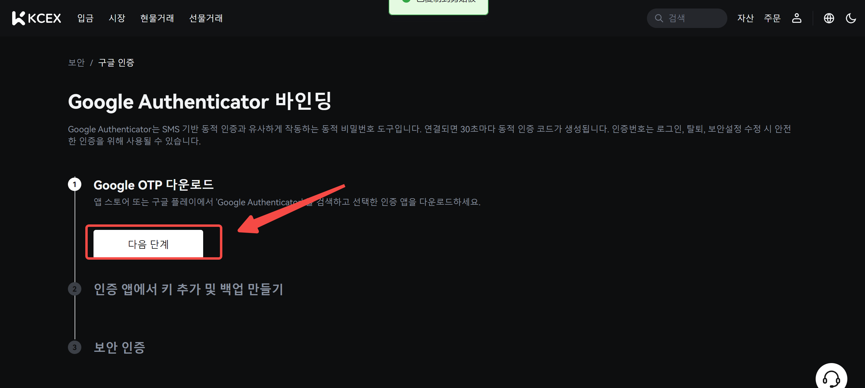 Google Authenticator는 SMS 기반 동적 인증과 비슷한 동적 비밀번호 도구입니다. 연결하면 30초마다 동적으로 생성되는 인증 코드를 사용합니다. 이 코드는 KCEX 계정 로그인, 출금 및 보안 설정 변경 시에 보안을 강화하는 데에 사용됩니다.