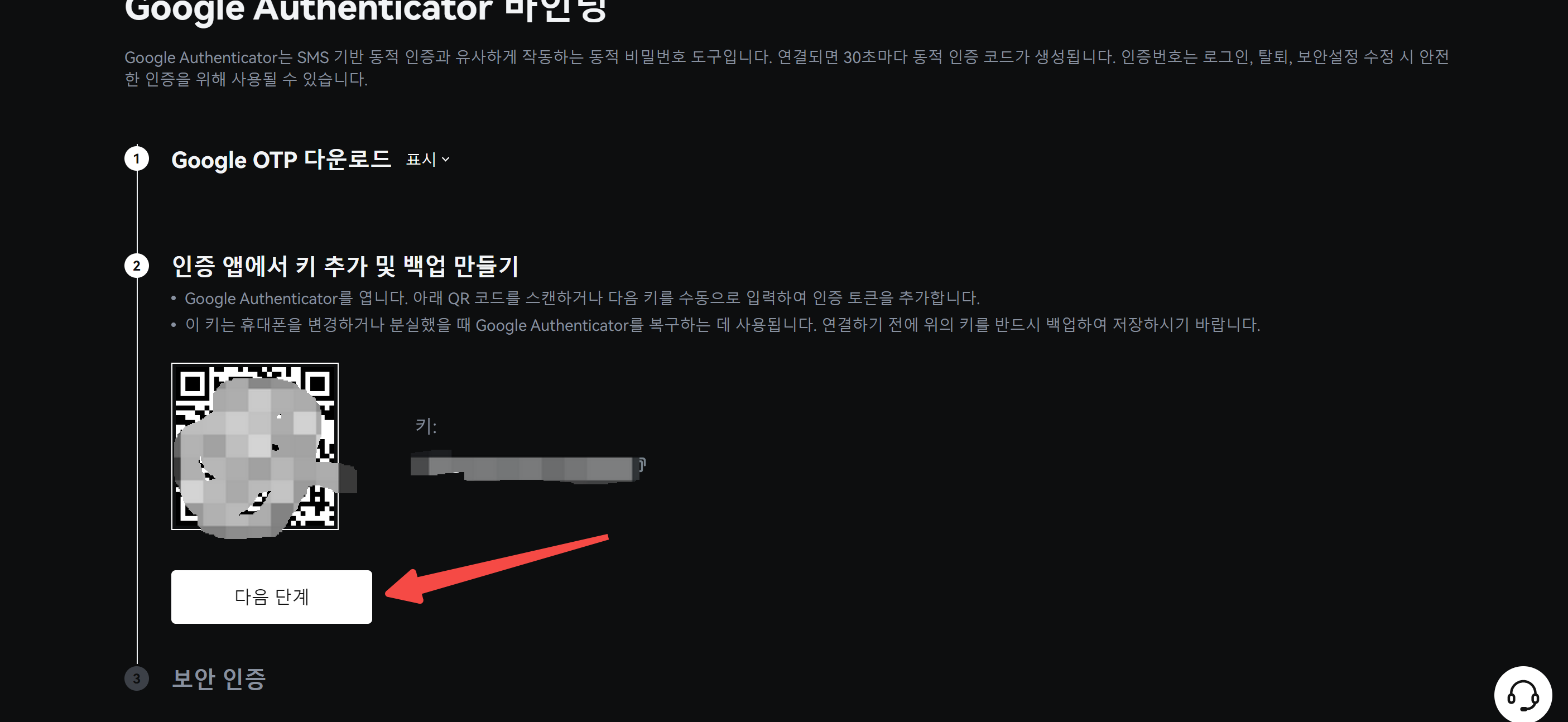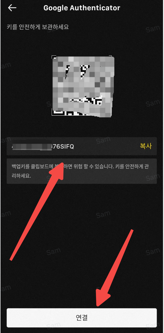 휴대폰을 변경하거나 분실한 경우를 대비하여 Google OTP 복구에 사용할 키를 안전하게 보관하세요. 연결 전 반드시 위의 키를 백업 및 저장해 주시기 바랍니다.