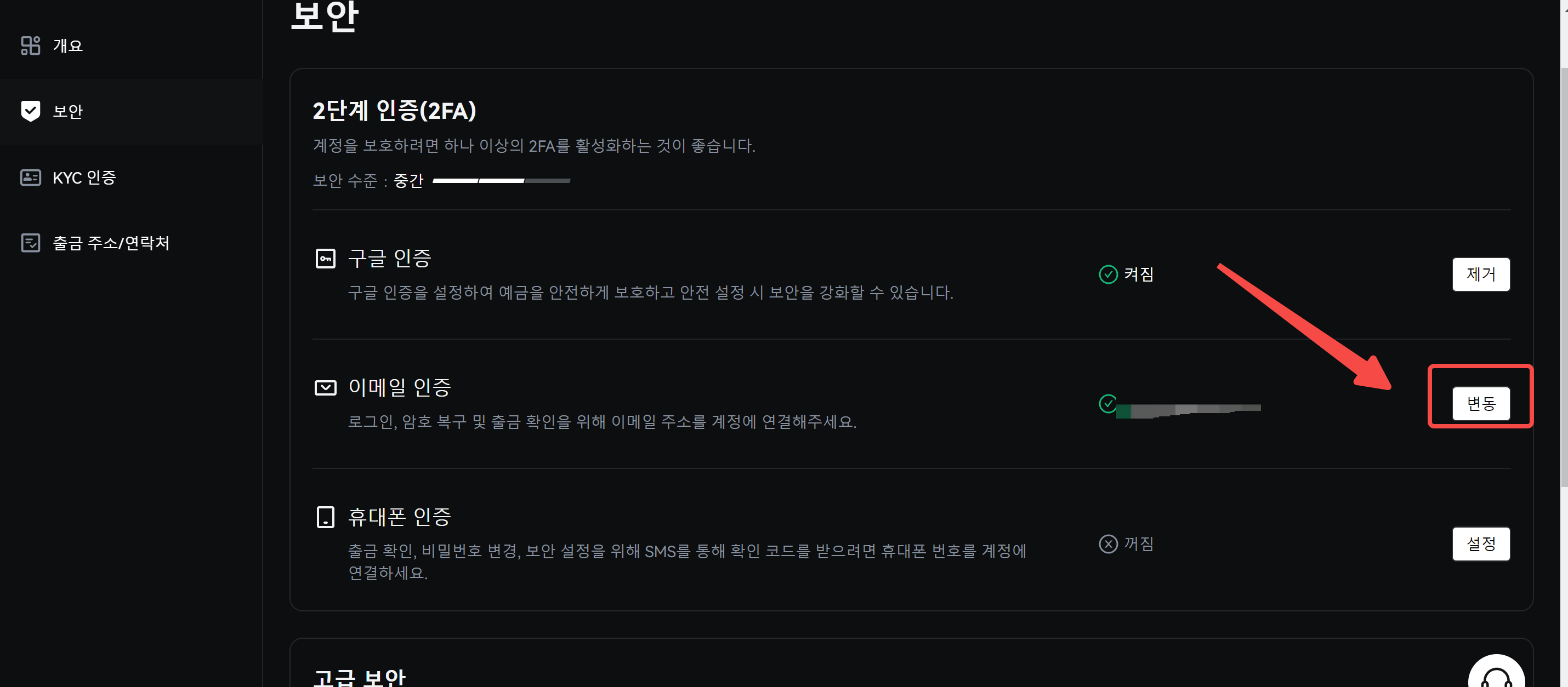 2. 이메일 확인 섹션에서 '변경'을 클릭합니다.