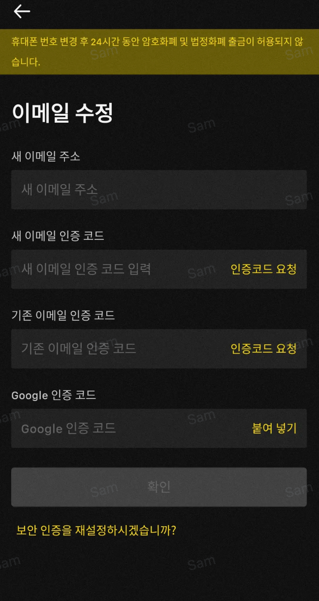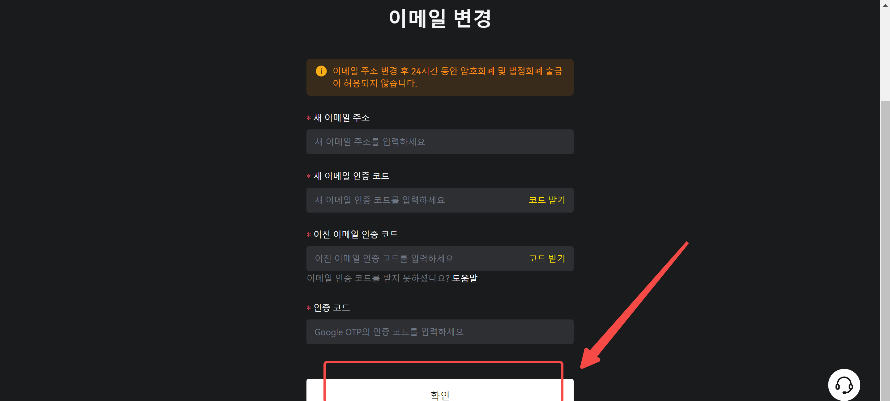 4. 새 이메일 주소, 새 이메일 인증 코드, 이전 이메일 인증 코드, 그리고 구글 인증 코드/SMS 인증 코드를 입력한 후 변경 절차를 완료하려면 클릭하세요.