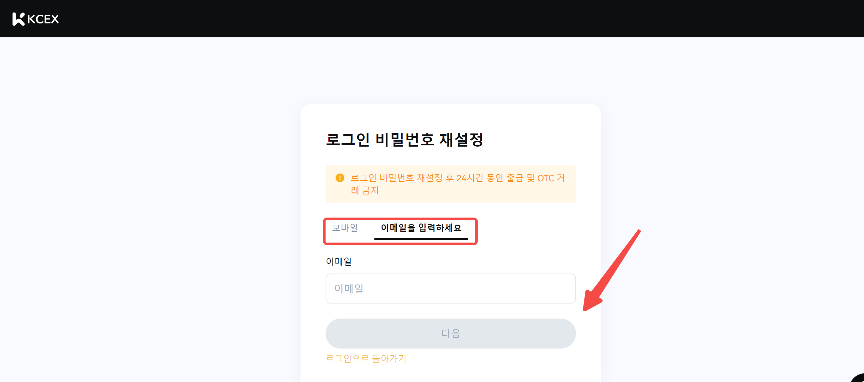 가. KCEX 공식 홈페이지에 로그인 후, 사용자 아이콘 - [보안]을 클릭하세요.