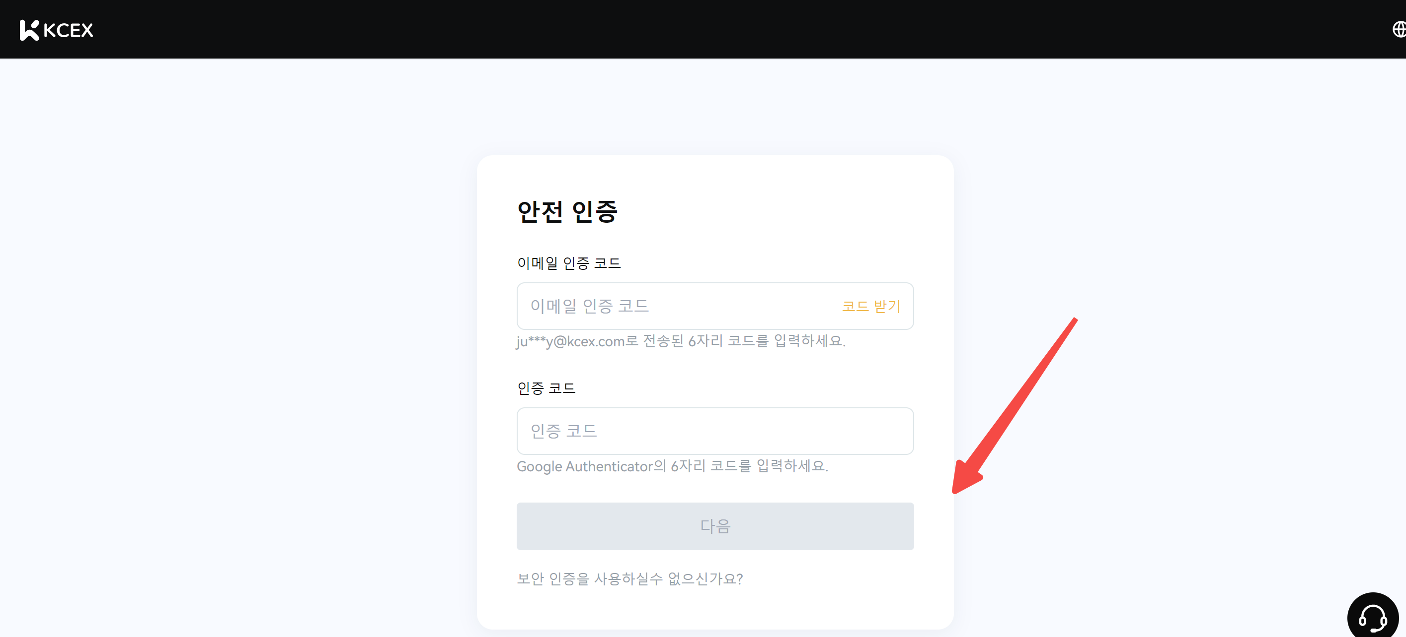 다. 이메일 인증코드/SMS 인증코드/Google 인증코드를 입력하고 '다음 단계'를 클릭하세요