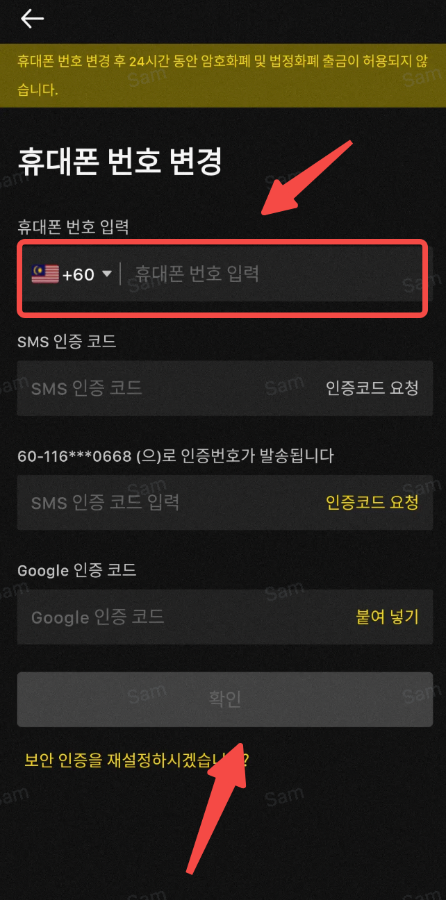3. 국가 번호를 선택하고 새 배터리 번호, 새 SMS 인증 코드, 기존 SMS 인증 및 Google 코드 인증 코드를 입력하세요. 마지막으로 [확인]을 클릭하여 변경을 완료합니다.